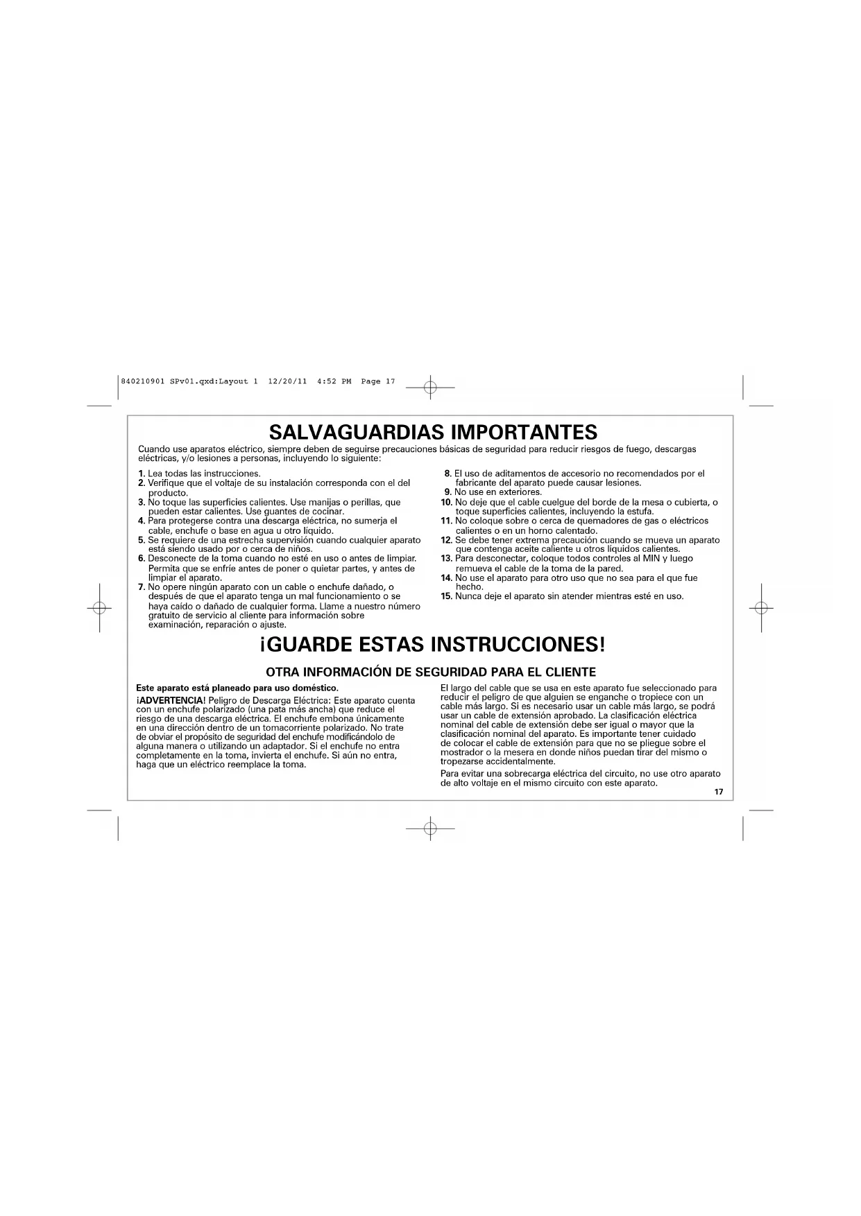 EXCEPCIONES Esta garantía no será efectiva en los siguientes casos: a) Cuando el producto se hubiese utlizado en condiciones distintas a las normales. (Uso industrial, semi-industrial o comercial.) b) Cuando el producto no hubiese sido operado de acuerdo con el instructivo de uso. c) Cuando el producto hubiese sido alterado o reparado por personas no autorizadas por Grupo HB PS, S.A. de C.V. el fabricante nacional, importador o comercializador responsable respectivo. d) Esta garantía pierde su validez si el producto es utilizado en un medio diferente a una vivienda unifamiliar o se somete a cualquier voltaje o forma de onda diferente a la especificada en la etiqueta de clasificación (ej., 120V ~ 60 Hz). El consumidor puede solicitar que se haga efectiva la garantía ante la propia casa comercial donde adquirió su producto, siempre y cuando Grupo HB PS, S.A. de C.V. no cuente con talleres de servicio. 840210901 SPv01.qxd:Layout 1 12/20/11 4:52 PM Page 2312/11840210901 PROCEDIMIENTO PARA HACER EFECTIVA LA GARANTÍA