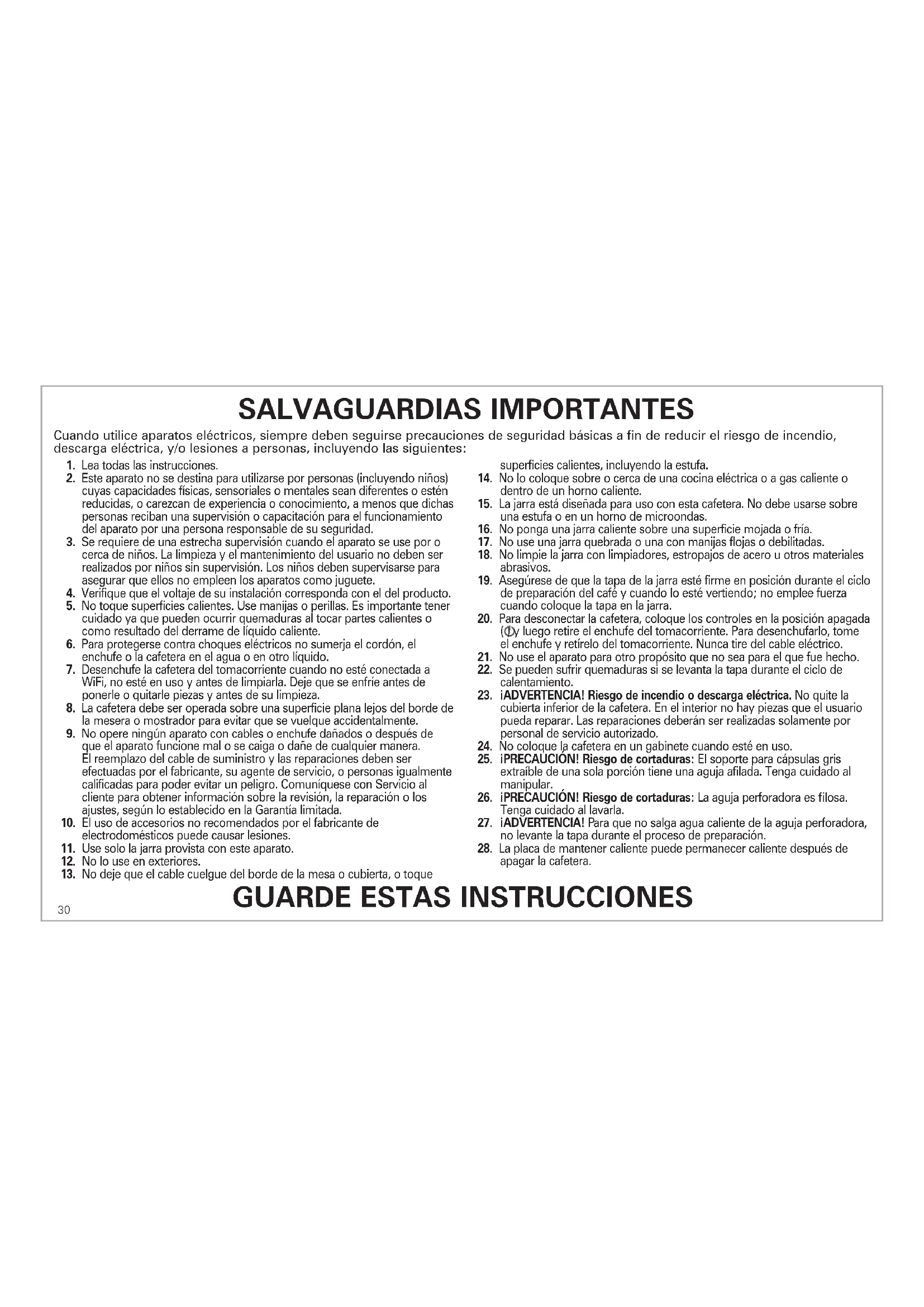 apagar la cafetera. Cuando utilice aparatos eléctricos, siempre deben seguirse precauciones de seguridad básicas a fin de reducir el riesgo de incendio, descarga eléctrica, y/o lesiones a personas, incluyendo las siguientes: