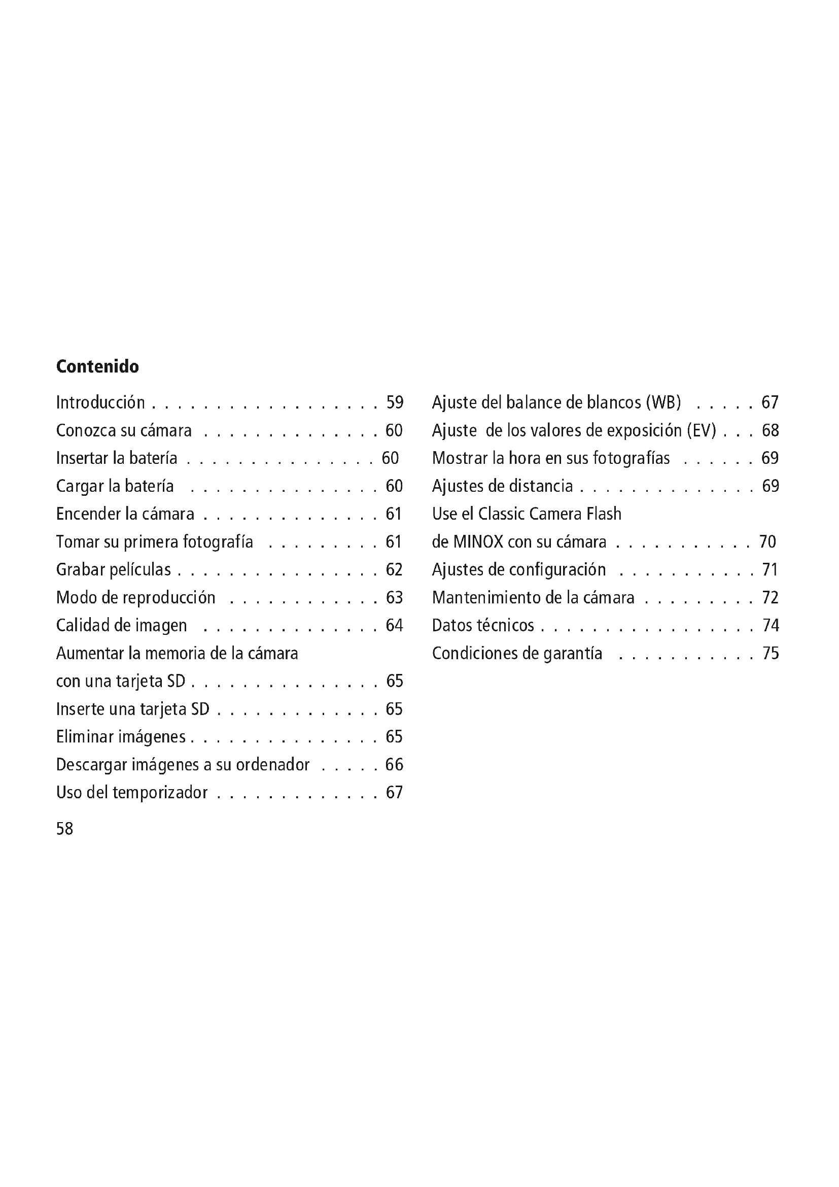 - nation correspondant se tient à la dispo sition des touristes, conformément aux règles qui régissent la prestation de garantie de la MINOX GmbH, sur présentation du justifi catif d'achat imprimé.58 Contenido Introducción p. 59