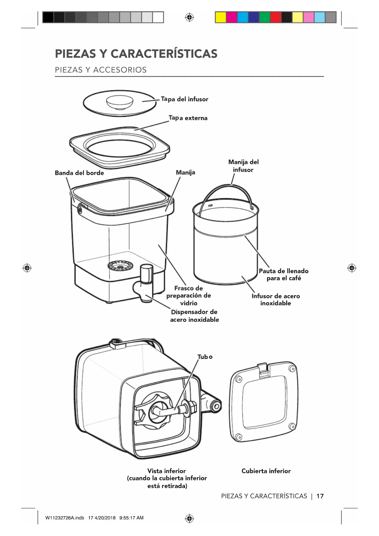 Frasco de preparación de vidrio Infusor de acero inoxidable Tapa del infusor Tapa externa Manija del infusor Manija Dispensador de acero inoxidable Vista inferior (cuando la cubierta inferior está retirada) Cubierta inferior Banda del borde Pauta de llenado para el café W11232726A.indb 17 4/20/2018 9:55:17 AM18 | SEGURIDAD DE LA CAFETERA
