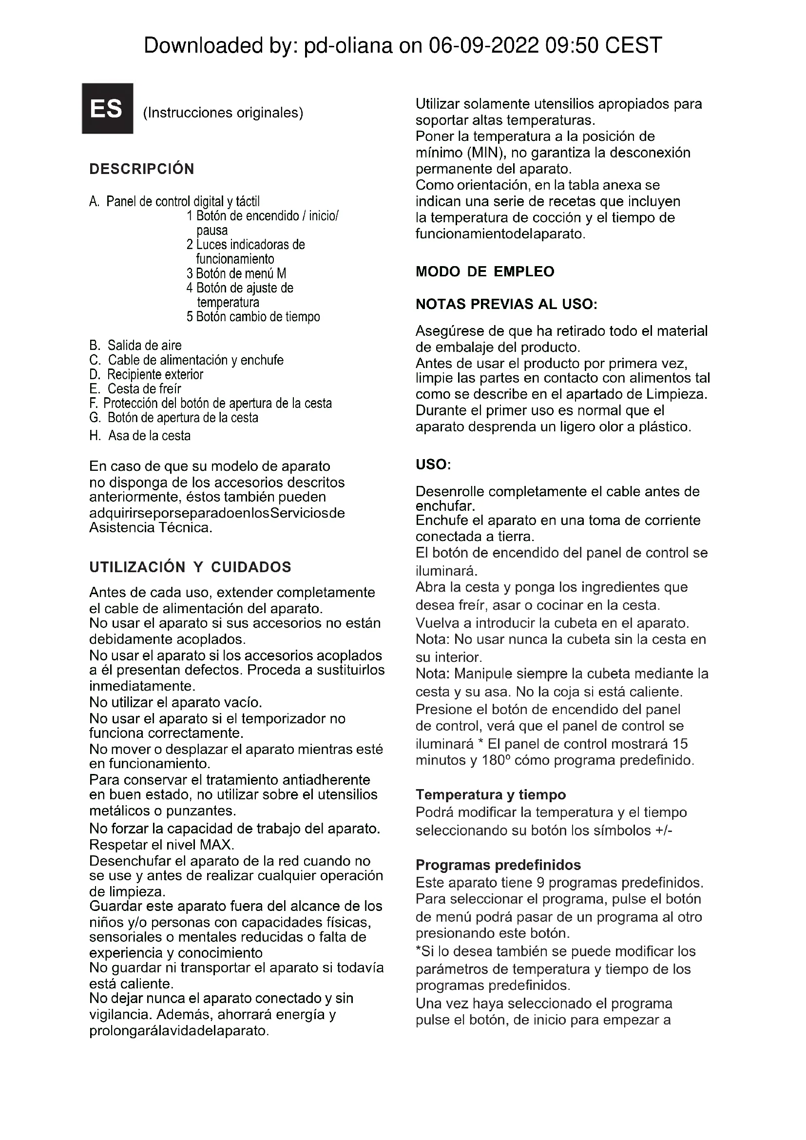 Downloaded by: pd-oliana on 06-09-2022 09:50 CESTES (Instrucciones originales) DESCRIPCIÓN A. Panel de control digital y táctil 1 Botón de encendido / inicio/ pausa 2 Luces indicadoras de funcionamiento 3 Botón de menú M 4 Botón de ajuste de temperatura 5 Botón cambio de tiempo B. Salida de aire C. Cable de alimentación y enchufe D. Recipiente exterior E. Cesta de freír F. Protección del botón de apertura de la cesta G. Botón de apertura de la cesta H. Asa de la cesta En caso de que su modelo de aparato no disponga de los accesorios descritos anteriormente, éstos también pueden adquirirse por separado en los Servicios de Asistencia Técnica.