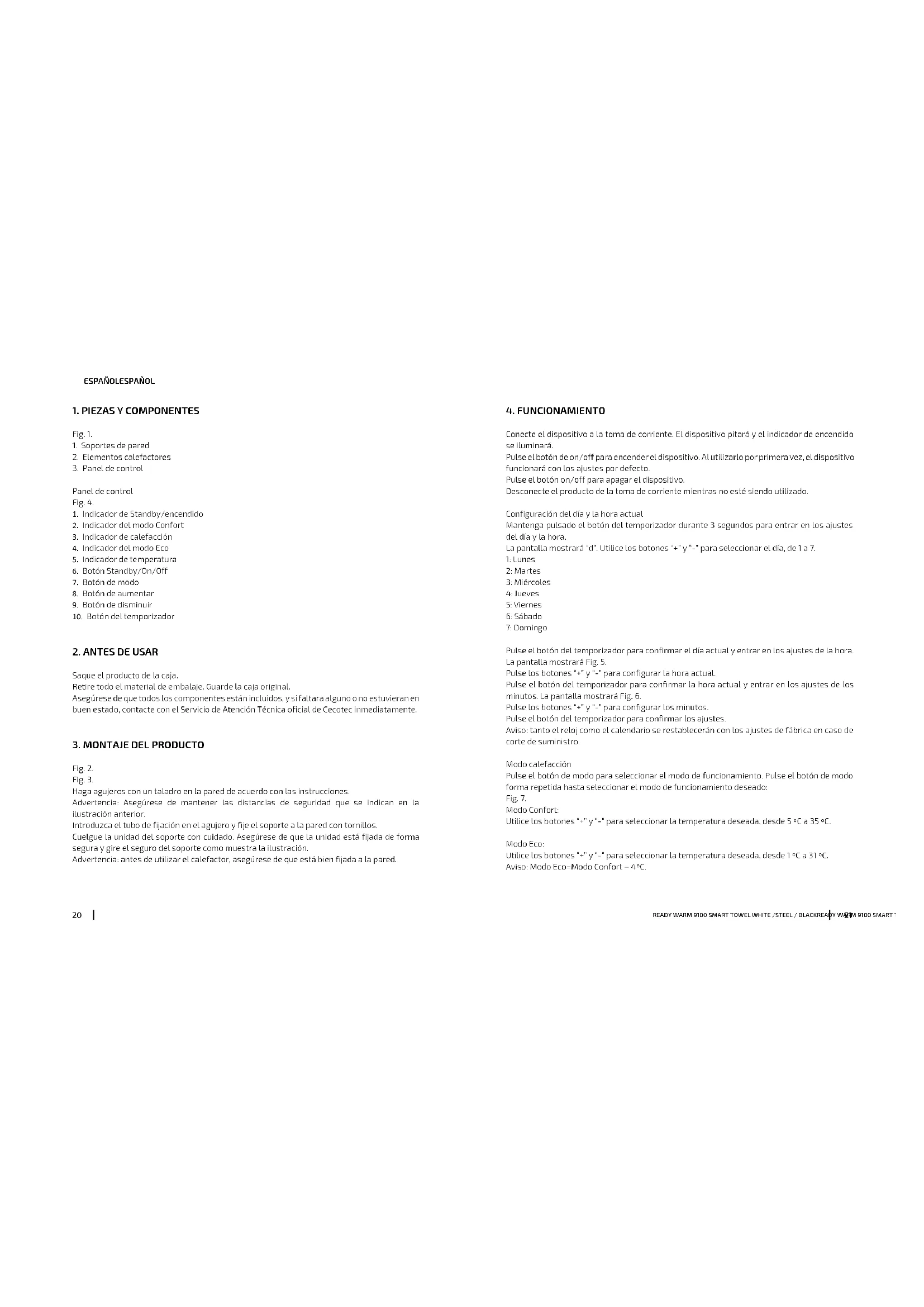 Conecte el dispositivo a la toma de corriente. El dispositivo pitará y el indicador de encendido se iluminará. Pulse el botón de on/off para encender el dispositivo. Al utilizarlo por primera vez, el dispositivo funcionará con los ajustes por defecto. Pulse el botón on/off para apagar el dispositivo. Desconecte el producto de la toma de corriente mientras no esté siendo utilizado. Configuración del día y la hora actual Mantenga pulsado el botón del temporizador durante 3 segundos para entrar en los ajustes del día y la hora. La pantalla mostrará “d”. Utilice los botones “+” y “-” para seleccionar el día, de 1 a 7. 1: Lunes 2: Martes 3: Miércoles 4: Jueves 5: Viernes 6: Sábado 7: Domingo Pulse el botón del temporizador para confirmar el día actual y entrar en los ajustes de la hora. La pantalla mostrará Fig. 5. Pulse los botones “+” y “-” para configurar la hora actual. Pulse el botón del temporizador para confirmar la hora actual y entrar en los ajustes de los minutos. La pantalla mostrará Fig. 6. Pulse los botones “+” y “-” para configurar los minutos. Pulse el botón del temporizador para confirmar los ajustes. Aviso: tanto el reloj como el calendario se restablecerán con los ajustes de fábrica en caso de corte de suministro. Modo calefacción Pulse el botón de modo para seleccionar el modo de funcionamiento. Pulse el botón de modo forma repetida hasta seleccionar el modo de funcionamiento deseado: Fig. 7. Modo Confort: Utilice los botones “+” y “-“ para seleccionar la temperatura deseada, desde 5 ºC a 35 ºC. Modo Eco: Utilice los botones “+” y “-“ para seleccionar la temperatura deseada, desde 1 ºC a 31 ºC. Aviso: Modo Eco=Modo Confort – 4ºC.READY WARM 9100 SMART TOWEL WHITE /STEEL / BLACKREADY WARM 9100 SMART TOWEL WHITE /STEEL / BLACK
