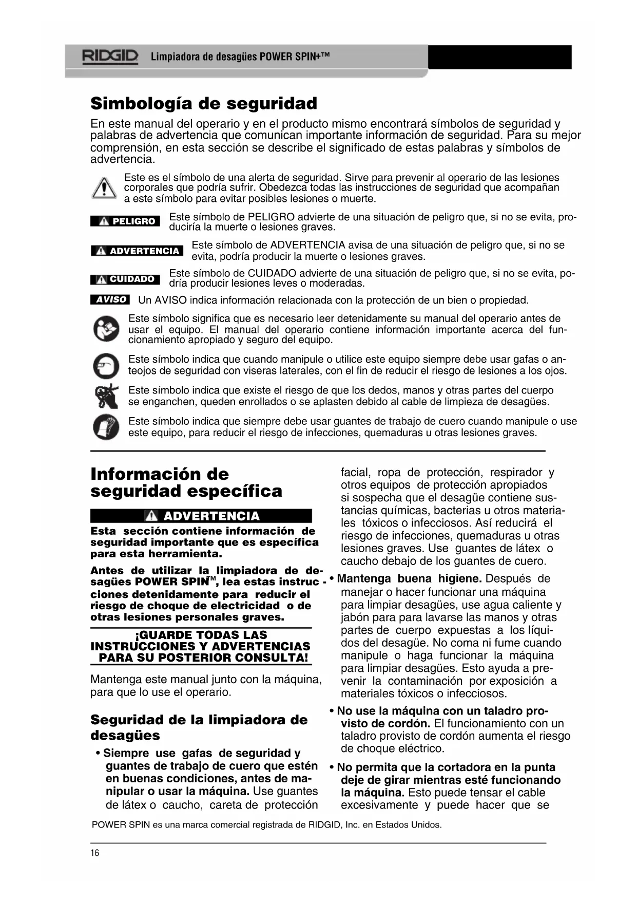 - Siempre use gafas de seguridad y guantes de trabajo de cuero que estén en buenas condiciones, antes de ma- nipular o usar la máquina. Use guantes de látex o caucho, careta de protección POWER SPIN es una marca comercial registrada de RIDGID, Inc. en Estados Unidos. Limpiadora de desagües POWER SPIN