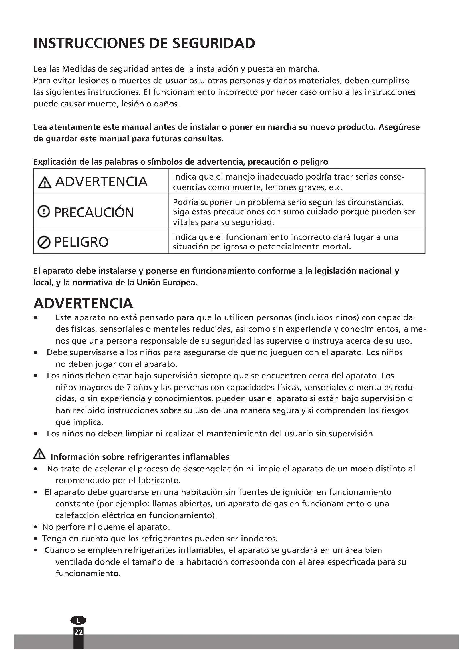 Lea las Medidas de seguridad antes de la instalación y puesta en marcha. Para evitar lesiones o muertes de usuarios u otras personas y daños materiales, deben cumplirse las siguientes instrucciones. El funcionamiento incorrecto por hacer caso omiso a las instrucciones puede causar muerte, lesión o daños. Lea atentamente este manual antes de instalar o poner en marcha su nuevo producto. Asegúrese de guardar este manual para futuras consultas. Explicación de las palabras o símbolos de advertencia, precaución o peligro ADVERTENCIA Indica que el manejo inadecuado podría traer serias conse- cuencias como muerte, lesiones graves, etc. PRECAUCIÓN Podría suponer un problema serio según las circunstancias. Siga estas precauciones con sumo cuidado porque pueden ser vitales para su seguridad. PELIGRO Indica que el funcionamiento incorrecto dará lugar a una situación peligrosa o potencialmente mortal. El aparato debe instalarse y ponerse en funcionamiento conforme a la legislación nacional y local, y la normativa de la Unión Europea. ADVERTENCIA
