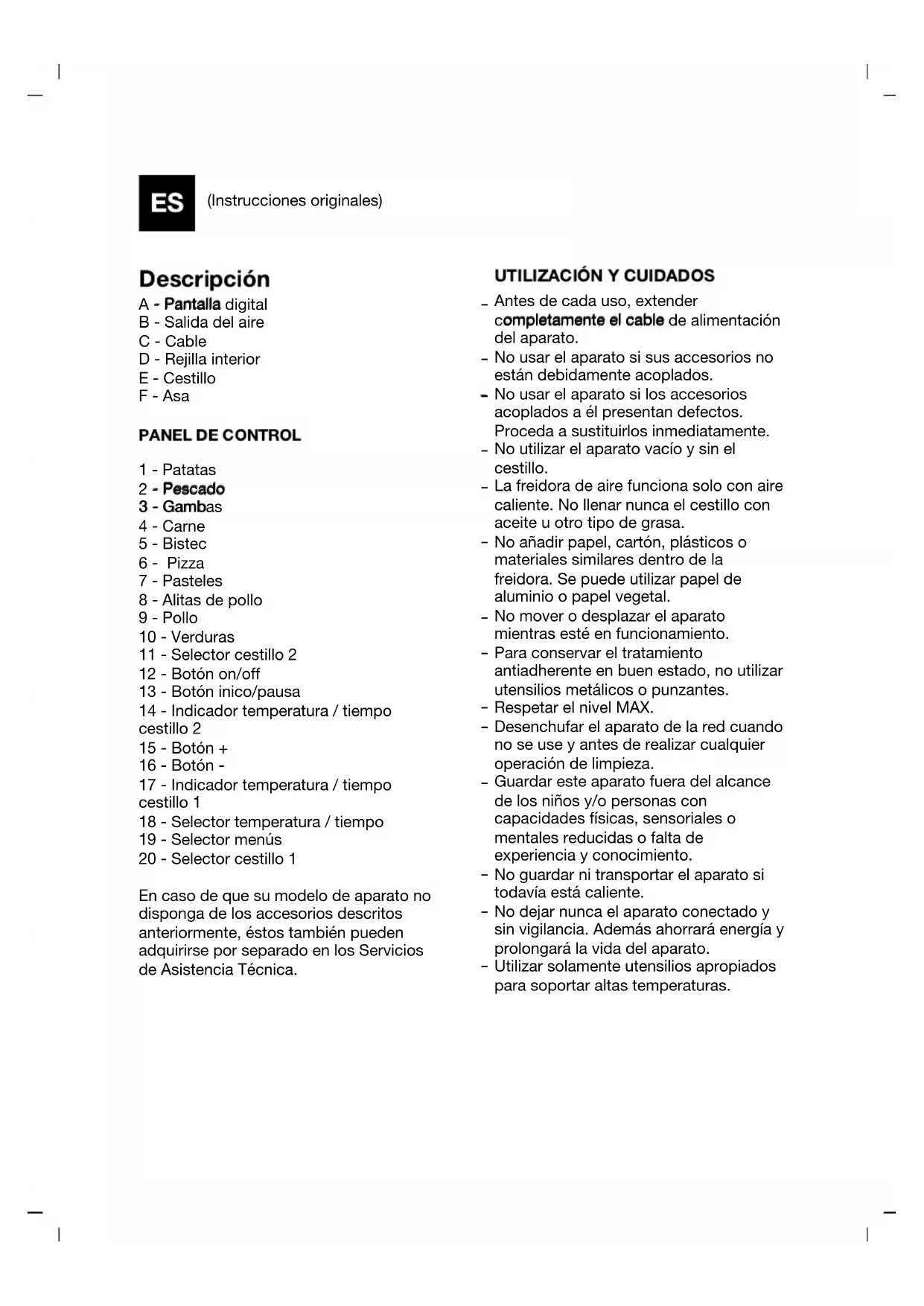 Antes de cada uso, extender completamente el cable de alimentación del aparato. No usar el aparato si sus accesorios no están debidamente acoplados. No usar el aparato si los accesorios acoplados a él presentan defectos. Proceda a sustituirlos inmediatamente. No utilizar el aparato vacío y sin el cestillo. La freidora de aire funciona solo con aire caliente. No llenar nunca el cestillo con aceite u otro tipo de grasa. No añadir papel, cartón, plásticos o materiales similares dentro de la freidora. Se puede utilizar papel de aluminio o papel vegetal. No mover o desplazar el aparato mientras esté en funcionamiento. Para conservar el tratamiento antiadherente en buen estado, no utilizar utensilios metálicos o punzantes. Respetar el nivel MAX. Desenchufar el aparato de la red cuando no se use y antes de realizar cualquier operación de limpieza. Guardar este aparato fuera del alcance de los niños y/o personas con capacidades físicas, sensoriales o mentales reducidas o falta de experiencia y conocimiento. No guardar ni transportar el aparato si todavía está caliente. No dejar nunca el aparato conectado y sin vigilancia. Además ahorrará energía y prolongará la vida del aparato. Utilizar solamente utensilios apropiados para soportar altas temperaturas.