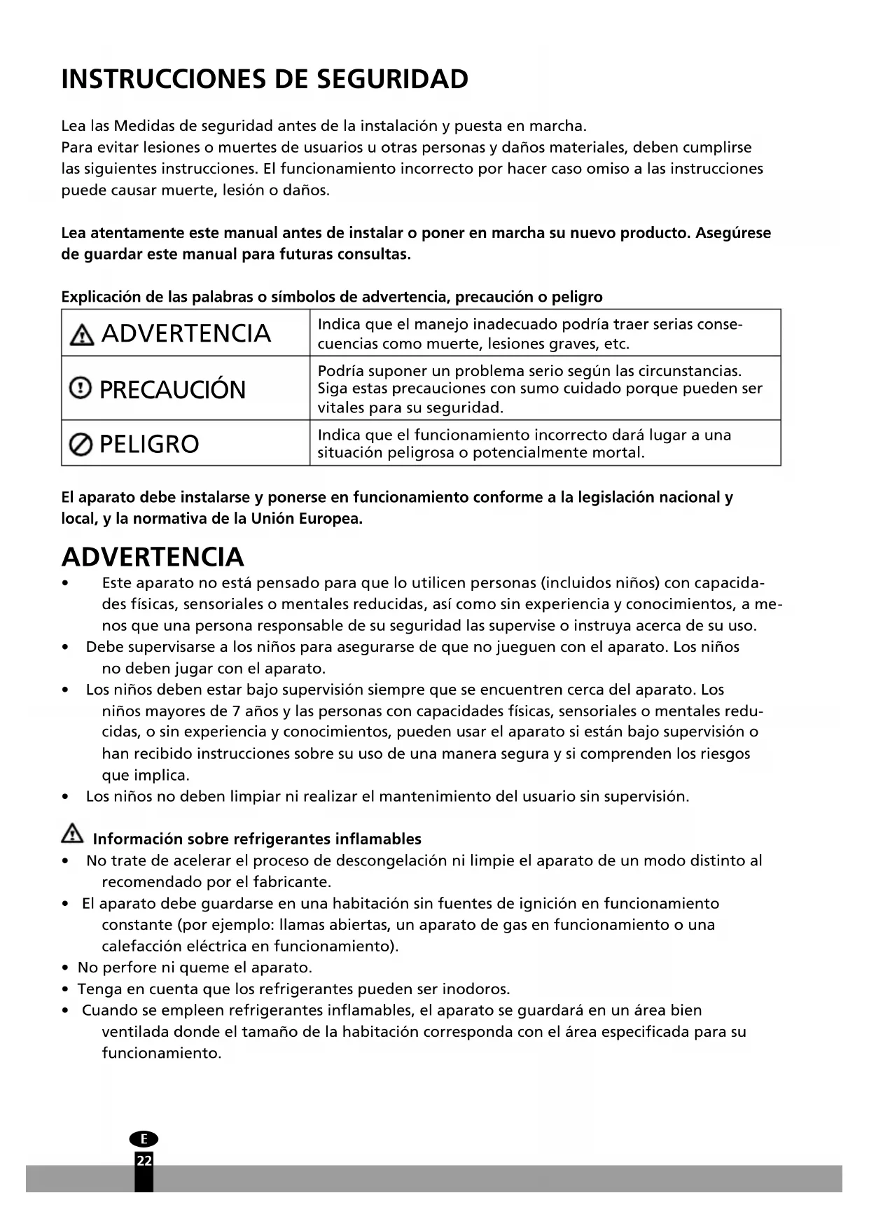 Lea las Medidas de seguridad antes de la instalación y puesta en marcha. Para evitar lesiones o muertes de usuarios u otras personas y daños materiales, deben cumplirse las siguientes instrucciones. El funcionamiento incorrecto por hacer caso omiso a las instrucciones puede causar muerte, lesión o daños. Lea atentamente este manual antes de instalar o poner en marcha su nuevo producto. Asegúrese de guardar este manual para futuras consultas. Explicación de las palabras o símbolos de advertencia, precaución o peligro ADVERTENCIA Indica que el manejo inadecuado podría traer serias conse- cuencias como muerte, lesiones graves, etc. PRECAUCIÓN Podría suponer un problema serio según las circunstancias. Siga estas precauciones con sumo cuidado porque pueden ser vitales para su seguridad. PELIGRO Indica que el funcionamiento incorrecto dará lugar a una situación peligrosa o potencialmente mortal. El aparato debe instalarse y ponerse en funcionamiento conforme a la legislación nacional y local, y la normativa de la Unión Europea. ADVERTENCIA