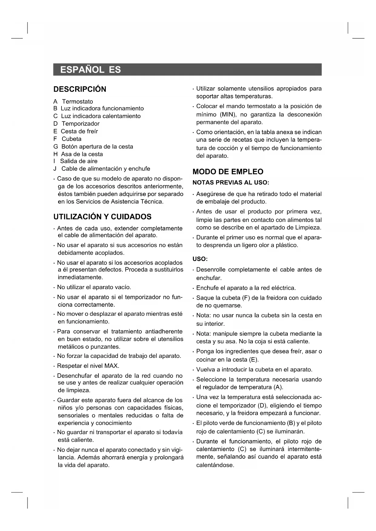 DESCRIPCIÓN A Termostato B Luz indicadora funcionamiento C Luz indicadora calentamiento D Temporizador E Cesta de freír F Cubeta G Botón apertura de la cesta H Asa de la cesta I Salida de aire J Cable de alimentación y enchufe