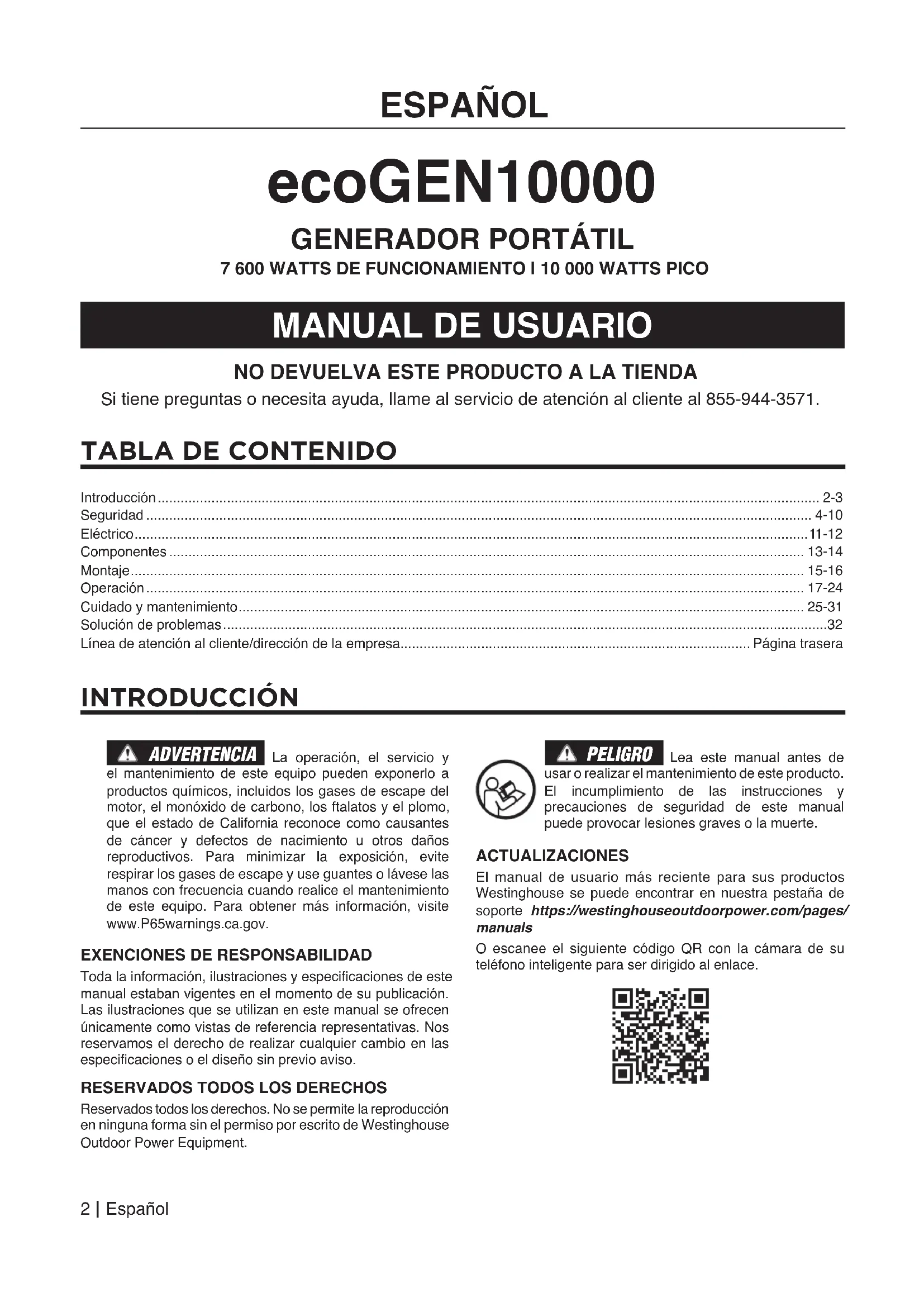 INTRODUCCIÓN ADVERTENCIA La operación, el servicio y el mantenimiento de este equipo pueden exponerlo a productos químicos, incluidos los gases de escape del motor, el monóxido de carbono, los ftalatos y el plomo, que el estado de California reconoce como causantes de cáncer y defectos de nacimiento u otros daños reproductivos. Para minimizar la exposición, evite respirar los gases de escape y use guantes o lávese las manos con frecuencia cuando realice el mantenimiento de este equipo. Para obtener más información, visite www.P65warnings.ca.gov. EXENCIONES DE RESPONSABILIDADToda la información, ilustraciones y especicaciones de este manual estaban vigentes en el momento de su publicación. Las ilustraciones que se utilizan en este manual se ofrecen únicamente como vistas de referencia representativas. Nos reservamos el derecho de realizar cualquier cambio en las especicaciones o el diseño sin previo aviso.RESERVADOS TODOS LOS DERECHOSReservados todos los derechos. No se permite la reproducción en ninguna forma sin el permiso por escrito de Westinghouse Outdoor Power Equipment. PELIGRO Lea este manual antes de usar o realizar el mantenimiento de este producto. El incumplimiento de las instrucciones y precauciones de seguridad de este manual puede provocar lesiones graves o la muerte.ACTUALIZACIONESEl manual de usuario más reciente para sus productos Westinghouse se puede encontrar en nuestra pestaña de soporte https://westinghouseoutdoorpower.com/pages/manualsO escanee el siguiente código QR con la cámara de su teléfono inteligente para ser dirigido al enlace. Introducción ............................................................................................................................................................................ 2-3 Seguridad ............................................................................................................................................................................. 4-10 Eléctrico ............................................................................................................................................................................... 11-12 Componentes ..................................................................................................................................................................... 13-14 Montaje ............................................................................................................................................................................... 15-16 Operación ........................................................................................................................................................................... 17-24 Cuidado y mantenimiento ................................................................................................................................................... 25-31 Solución de problemas .............................................................................................................................................................32 Línea de atención al cliente/dirección de la empresa........................................................................................... Página traseraEspañol