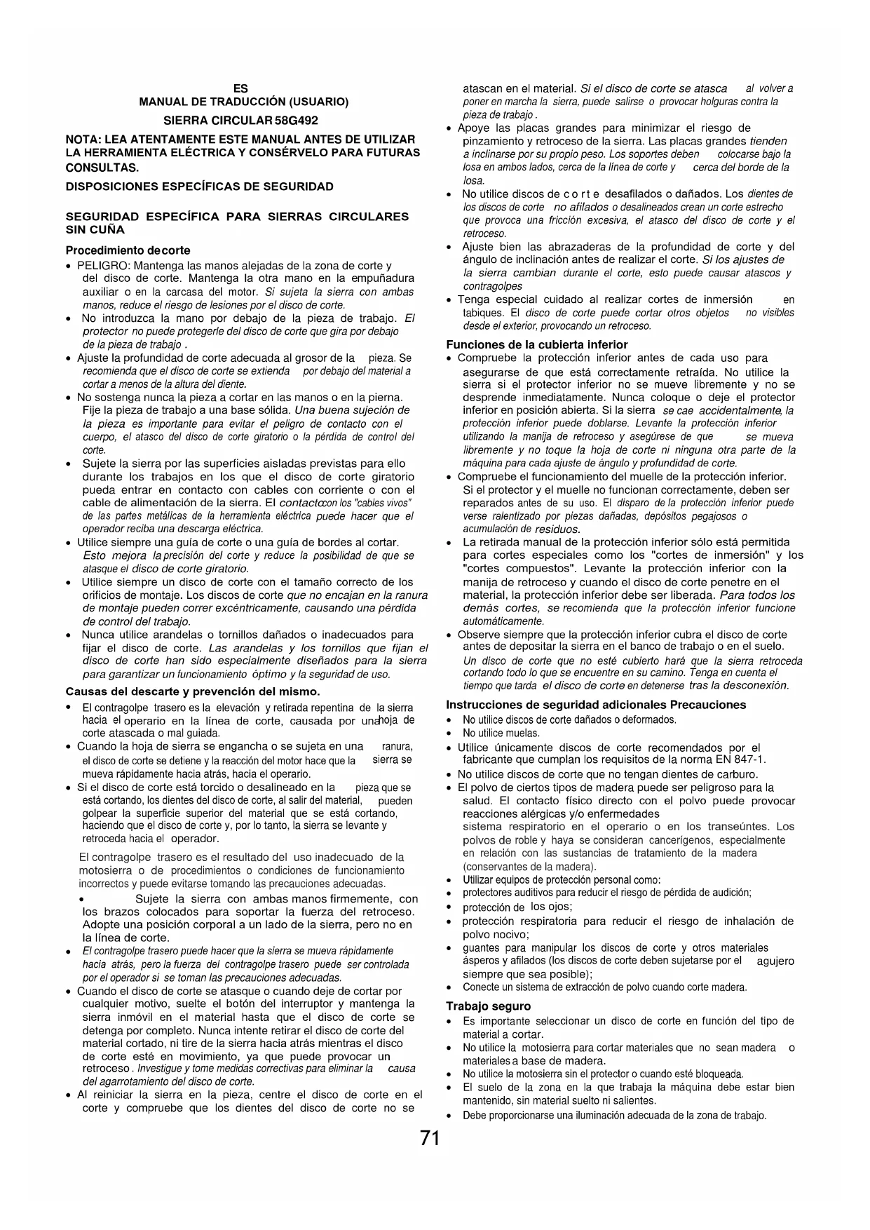 MANUAL DE TRADUCCIÓN (USUARIO) SIERRA CIRCULAR 58G492 NOTA: LEA ATENTAMENTE ESTE MANUAL ANTES DE UTILIZAR LA HERRAMIENTA ELÉCTRICA Y CONSÉRVELO PARA FUTURAS CONSULTAS.