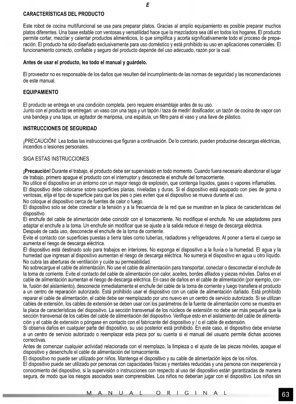 ¡Precaución! Durante el trabajo, el producto debe ser supervisado en todo momento. Cuando fuera necesario abandonar el lugar de trabajo, primero apague el producto con el interruptor y desconecte el enchufe del tomacorriente. No utilice el dispositivo en un entorno con un mayor riesgo de explosión, que contenga líquidos, gases o vapores inflamables. El dispositivo debe colocarse sobre superficies planas, niveladas y duras. Si el dispositivo está equipado con pies de goma o ventosas, elija el tipo de superficie para que los pies o pies eviten que el dispositivo se mueva durante el uso. No coloque el dispositivo cerca de fuentes de calor o fuego. El dispositivo solo se debe conectar a la tensión y a la frecuencia de la red que se muestran en la placa de características del dispositivo. El enchufe del cable de alimentación debe coincidir con el tomacorriente. No modifique el enchufe. No use adaptadores para adaptar el enchufe a la toma. Un enchufe sin modificar que se ajuste a la salida reduce el riesgo de descarga eléctrica. Después de cada uso, desconecte el enchufe de la toma de corriente. Evite el contacto con superficies puestas a tierra tales como tuberías, radiadores y refrigeradores. Al poner a tierra el cuerpo se aumenta el riesgo de descarga eléctrica. El dispositivo está destinado solo para trabajos en interiores. No exponga el dispositivo a la lluvia o la humedad. El agua y la humedad que ingresan al dispositivo aumentan el riesgo de descarga eléctrica. No sumerja el dispositivo en agua u otro líquido. No cubra las aberturas de ventilación y cuide su permeabilidad. No sobrecargue el cable de alimentación. No use el cable de alimentación para transportar, conectar o desconectar el enchufe de la toma de corriente. Evite el contacto del cable de alimentación con calor, aceites, bordes afilados y piezas móviles. Daños en el cable de alimentación aumentan el riesgo de descarga eléctrica. En caso de daños en el cable de alimentación (por ejemplo, cor- te, fusión del aislamiento), desconecte inmediatamente el enchufe del cable de la toma de corriente y luego transfiera el producto a un centro de reparación autorizado. Está prohibido usar el dispositivo con un cable de alimentación dañado. Está prohibido reparar el cable de alimentación, el cable debe ser reemplazado por uno nuevo en un centro de servicio autorizado. Si se utilizan cables de extensión, los cables de extensión se deben usar con los parámetros de la fuente de alimentación como se muestra en la placa de características del dispositivo. La sección transversal de los núcleos de extensión no debe ser más pequeña que la sección transversal de los cables del cable de alimentación del dispositivo. Verifique esto en el aislamiento del cable de alimenta- ción y el cable de extensión o póngase en contacto con el fabricante del dispositivo y / o el cable de extensión. Si observa daños en cualquier parte del dispositivo, su uso posterior está prohibido. En este caso, el dispositivo debe enviarse a un centro de servicio autorizado o reemplazar esta pieza por su cuenta si el manual del usuario permite dichas acciones correctivas. Antes de comenzar cualquier actividad relacionada con el reemplazo, la limpieza o el ajuste de las piezas móviles, apague el dispositivo y desenchufe el cable de alimentación del tomacorriente. El dispositivo no puede ser utilizado por niños. Mantenga el dispositivo y su cable de alimentación lejos de los niños. El dispositivo puede ser utilizado por personas con capacidades físicas y mentales reducidas y una persona con inexperiencia y conocimiento del dispositivo, si la supervisión o instrucciones con respecto al uso del dispositivo están garantizadas de manera segura, de modo que los riesgos asociados sean comprensibles. Los niños no deberían jugar con el dispositivo. Los niños sin64 MANUAL ORIGINAL