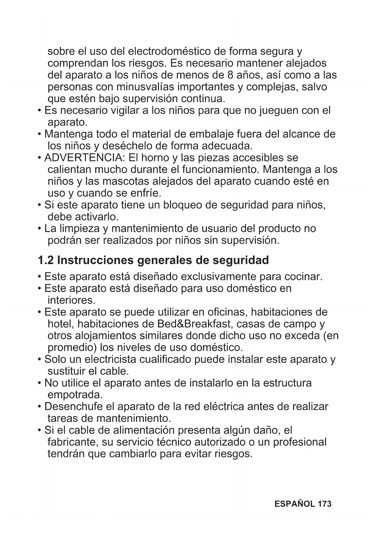 - Este aparato puede ser utilizado por niños de 8 años en adelante y personas cuyas capacidades físicas, sensoriales o mentales estén disminuidas o que carezcan de la experiencia y conocimientos suficientes para manejarlo, siempre que cuenten con las instrucciones o la supervisión 172 ESPAÑOLsobre el uso del electrodoméstico de forma segura y comprendan los riesgos. Es necesario mantener alejados del aparato a los niños de menos de 8 años, así como a las personas con minusvalías importantes y complejas, salvo que estén bajo supervisión continua.