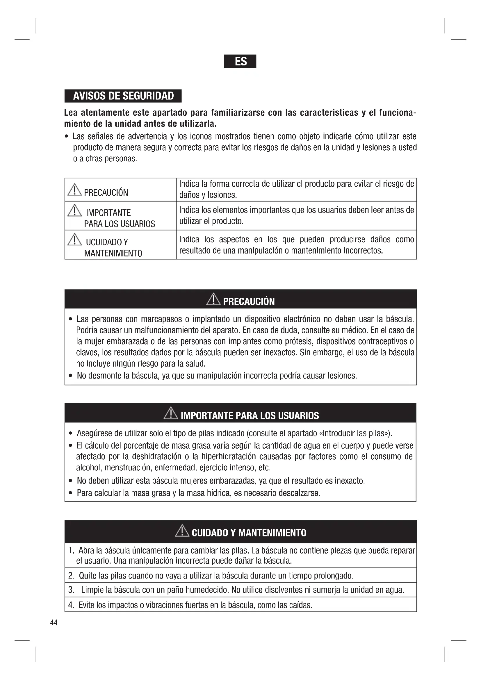 - No desmonte la báscula, ya que su manipulación incorrecta podría causar lesiones. PRECAUCIÓN