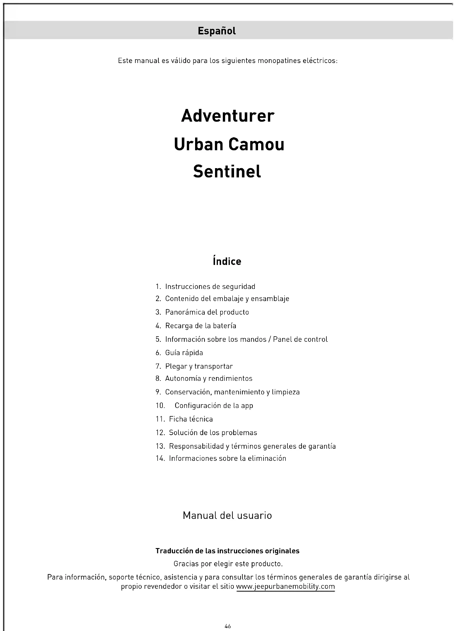 - En los puntos de venta de nuevos equipos eléctricos y electrónicos. Aquí se pueden entregar gratuitamente los RAEE de muy pequeñas dimensiones (con el lado Aquí se pueden entregar gratuitamente los RAEE de muy pequeñas dimensiones (con el lado más largo inferior a 25 cm), mientras que los de dimensiones mayores pueden ser entregados en modalidad 1 contra 1, es decir, entregando el viejo producto en el momento en que se compra uno nuevo con las mismas funciones. Además, la modalidad 1 contra 1 siempre está garantizada durante el acto de compra por parte del consumidor de una nueva AEE, con independencia del tamaño del RAEE. Encasodeeliminaciónincorrectadeequiposeléctricosoelectrónicos,puedenaplicarselassancionesespecícasprevistas por la legislación de protección del medio ambiente. CuandolosRAEEcontenganpilasoacumuladores,estosdeberánretirarseysometerseaunarecogidaselectivaespecíca. ATENCIÓN Tratamiento de las Batería agotadas (aplicable en todos los países de la Unión Europea y en otros sistemas europeos con sistema de recogida selectiva) Este símbolo en el producto o en el empaque indica que la batería no debe ser considerada un desecho doméstico normal. En algunos tipos de batería este símbolo podría ser utilizado en combinación con un símbolo químico. Los símbolos químicos del Mercurio (Hg) o del Plomos (Pb) se añaden si la batería contiene más del 0,0005% de mercurio o del 0,004% de plomo. Asegurándose de que las pilas-baterías sean eliminadas correctamente, contribuirá a prevenir potenciales consecuencias negativas para el ambiente y para la salud que podrían de lo contrario ser causadas por su eliminación inadecuada. El reciclaje de los materiales ayuda a conservar los recursos naturales. En caso de productos que, por motivos de seguridad, rendimiento o protección de los datos requieran una conexiónjaaunapila/bateríainterna,lamismadeberásersustituidasolopor personaldeasistenciacualicado. Entregarelproductoalnaldesuvidaútilenpuntosderecogidaadecuadosparalaeliminacióndeaparatoseléctricosy electrónicos. Esto garantiza que también la pila en su interior se tratará correctamente. Para obtener información más detallada sobre la eliminación de la pila-batería agotada o del producto, póngase en contacto con el servicio de eliminación de residuos domésticos o con la tienda donde compró el producto. En cualquier caso, la eliminación debe realizarse de acuerdo con la normativa vigente en el país de compra.68 Mode d’emploi Table des matières Traduction des instructions originales Nous vous remercions pour avoir choisi ce produit. Pour toute information, pour bénécier du SAV, et pour consulter les conditions générales de garantie, contactez le revendeur ou visiter le site www.jeepurbanemobility.com Ce manuel est valable pour les modèles suivants de trottinettes électriques : Adventurer Urban Camou Sentinel Français