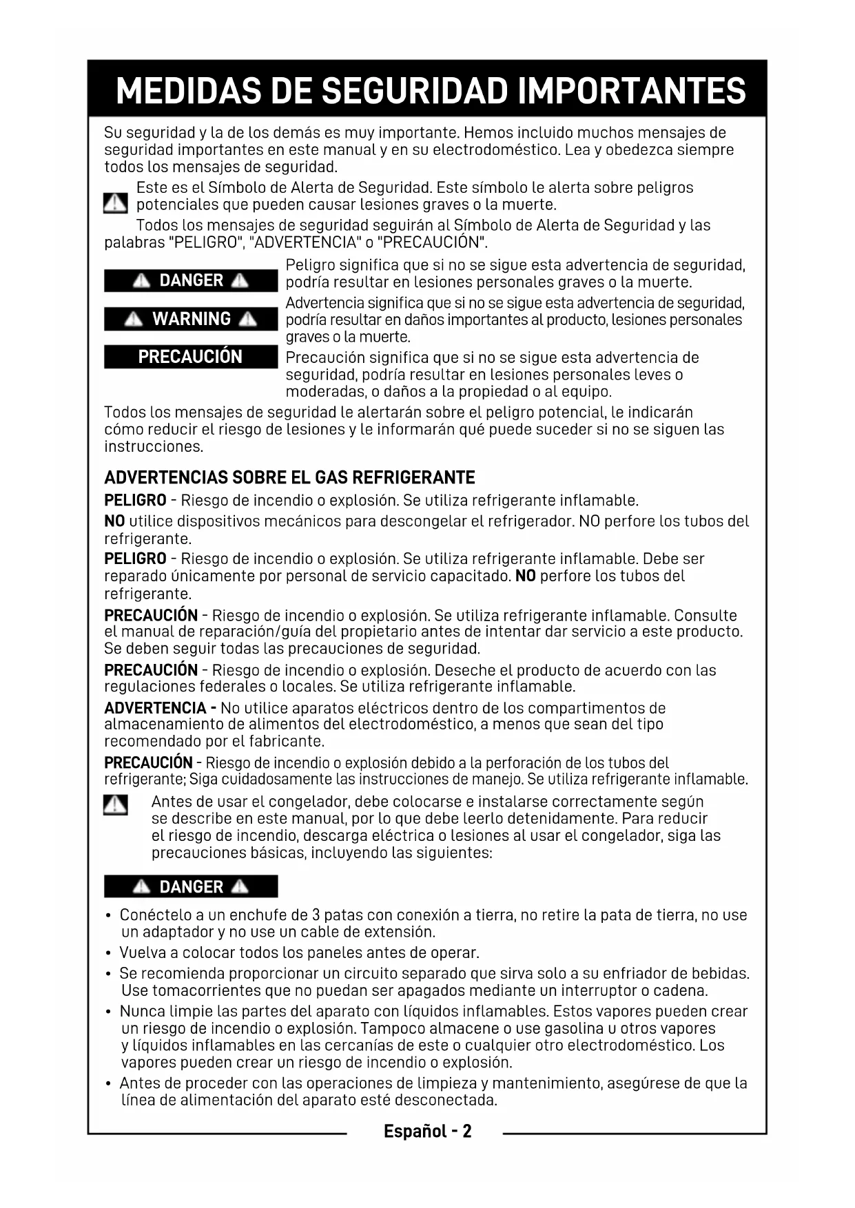 PELIGRO - Riesgo de incendio o explosión. Se utiliza refrigerante inflamable. NO utilice dispositivos mecánicos para descongelar el refrigerador. NO perfore los tubos del refrigerante. PELIGRO - Riesgo de incendio o explosión. Se utiliza refrigerante inflamable. Debe ser reparado únicamente por personal de servicio capacitado. NO perfore los tubos del refrigerante. PRECAUCIÓN - Riesgo de incendio o explosión. Se utiliza refrigerante inflamable. Consulte el manual de reparación/guía del propietario antes de intentar dar servicio a este producto. Se deben seguir todas las precauciones de seguridad. PRECAUCIÓN - Riesgo de incendio o explosión. Deseche el producto de acuerdo con las regulaciones federales o locales. Se utiliza refrigerante inflamable. ADVERTENCIA - No utilice aparatos eléctricos dentro de los compartimentos de almacenamiento de alimentos del electrodoméstico, a menos que sean del tipo recomendado por el fabricante. PRECAUCIÓN - Riesgo de incendio o explosión debido a la perforación de los tubos del refrigerante; Siga cuidadosamente las instrucciones de manejo. Se utiliza refrigerante inflamable. Antes de usar el congelador, debe colocarse e instalarse correctamente según se describe en este manual, por lo que debe leerlo detenidamente. Para reducir el riesgo de incendio, descarga eléctrica o lesiones al usar el congelador, siga las precauciones básicas, incluyendo las siguientes: