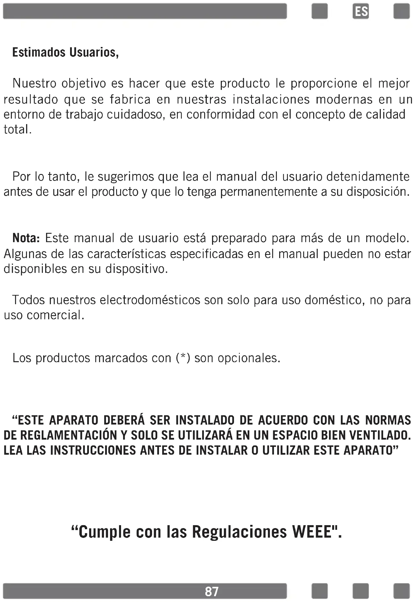 ENVIRONMENTALLY-FRIENDLY DISPOSAL Dispose of packaging in an environmentally-friendly manner. This appliance is labelled in accordance with European Directive 2012/19/EU concerning used electrical and electronic appliances (waste electrical and electronic equipment - WEEE). The guideline determines the frame work for the return and recycling of used appliances as applicable throughout to the EU. PACKAGE INFORMATION Packaging materials of the product are manufactured from recyclable materials in accordance with our National Environment Regulations. Do not dispose of the packaging materials together with the domestic or other wastes. Take them to the packaging material collection points designated by the local authorities. GB87 Estimados Usuarios, Nuestro objetivo es hacer que este producto le proporcione el mejor resultado que se fabrica en nuestras instalaciones modernas en un entorno de trabajo cuidadoso, en conformidad con el concepto de calidad total. Por lo tanto, le sugerimos que lea el manual del usuario detenidamente antes de usar el producto y que lo tenga permanentemente a su disposición. Nota: Este manual de usuario está preparado para más de un modelo. Algunas de las características especicadas en el manual pueden no estar disponibles en su dispositivo. Todos nuestros electrodomésticos son solo para uso doméstico, no para uso comercial. Los productos marcados con (*) son opcionales. “ESTE APARATO DEBERÁ SER INSTALADO DE ACUERDO CON LAS NORMAS DE REGLAMENTACIÓN Y SOLO SE UTILIZARÁ EN UN ESPACIO BIEN VENTILADO. LEA LAS INSTRUCCIONES ANTES DE INSTALAR O UTILIZAR ESTE APARATO” “Cumple con las Regulaciones WEEE". ES88