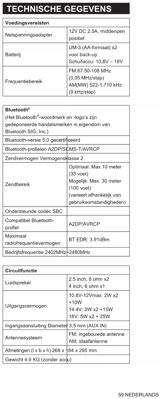 recomendamos poner el volumen a más de dos tercios en su dispositivo de audio y a continuación, ajustar el volumen de la radio según necesite. Nota: El cable de audio no está incluido como accesorio estándar. MANTENIMIENTO PRECAUCIÓN: ● Nunca utilice gasolina, benceno, disolvente, alcohol o un producto similar. Se puede provocar una decoloración, una deformación o grietas. ● No lave la radio con agua. ESPECIFICACIONES Requisitos de alimentación Adaptador de alimentación CA DC 12 V 2.5A, clavija central positiva Batería 2 UM-3 (tamaño AA) para respaldo Batería deslizante: 10,8 V - 18 V Cobertura de frecuencias FM: 87.50 - 108 MHz (0.05 MHz/intervalo) AM (MW): 522 - 1,710 kHz (9 kHz/intervalo) Bluetooth