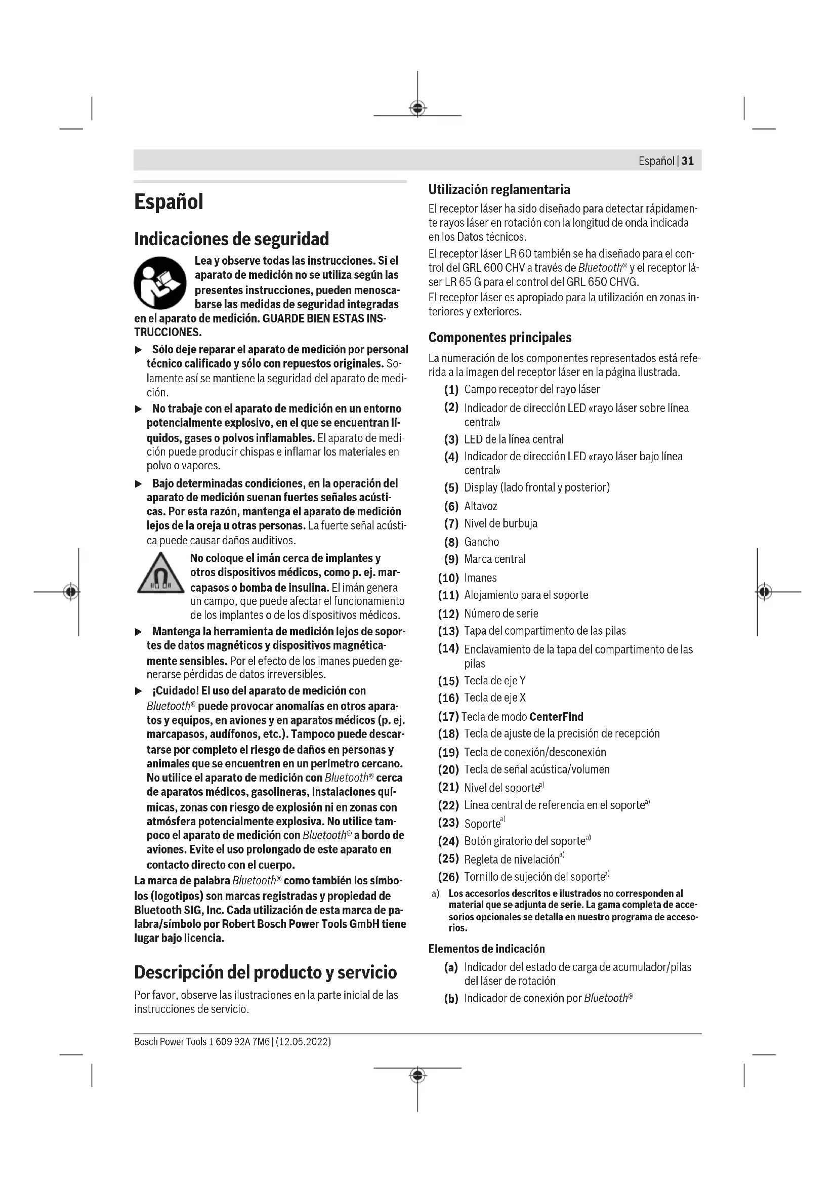 Los accesorios descritos e ilustrados no corresponden al material que se adjunta de serie. La gama completa de acce- sorios opcionales se detalla en nuestro programa de acceso- rios. Elementos de indicación (a) Indicador del estado de carga de acumulador/pilas del láser de rotación (b) Indicador de conexión por Bluetooth® Bosch Power Tools 1 609 92A 7M6 | (12.05.2022)32 | Español (c) Indicador de precisión de recepción (d) Unidad de medida indicada (e) Indicador de textos (f) Indicador de dirección «rayo láser bajo línea cen- tral» (g) Indicador de señal acústica/volumen (h) Indicador de línea central (i) Indicador de pilas del receptor láser (j) Indicador de dirección «rayo láser sobre línea cen- tral» Datos técnicos Receptor láser LR 60 LR 65G Número de artículo 3601K69P.. 3601K69T.. Longitudes de onda detectables 600−800nm 500−570nm Área de trabajo máx.