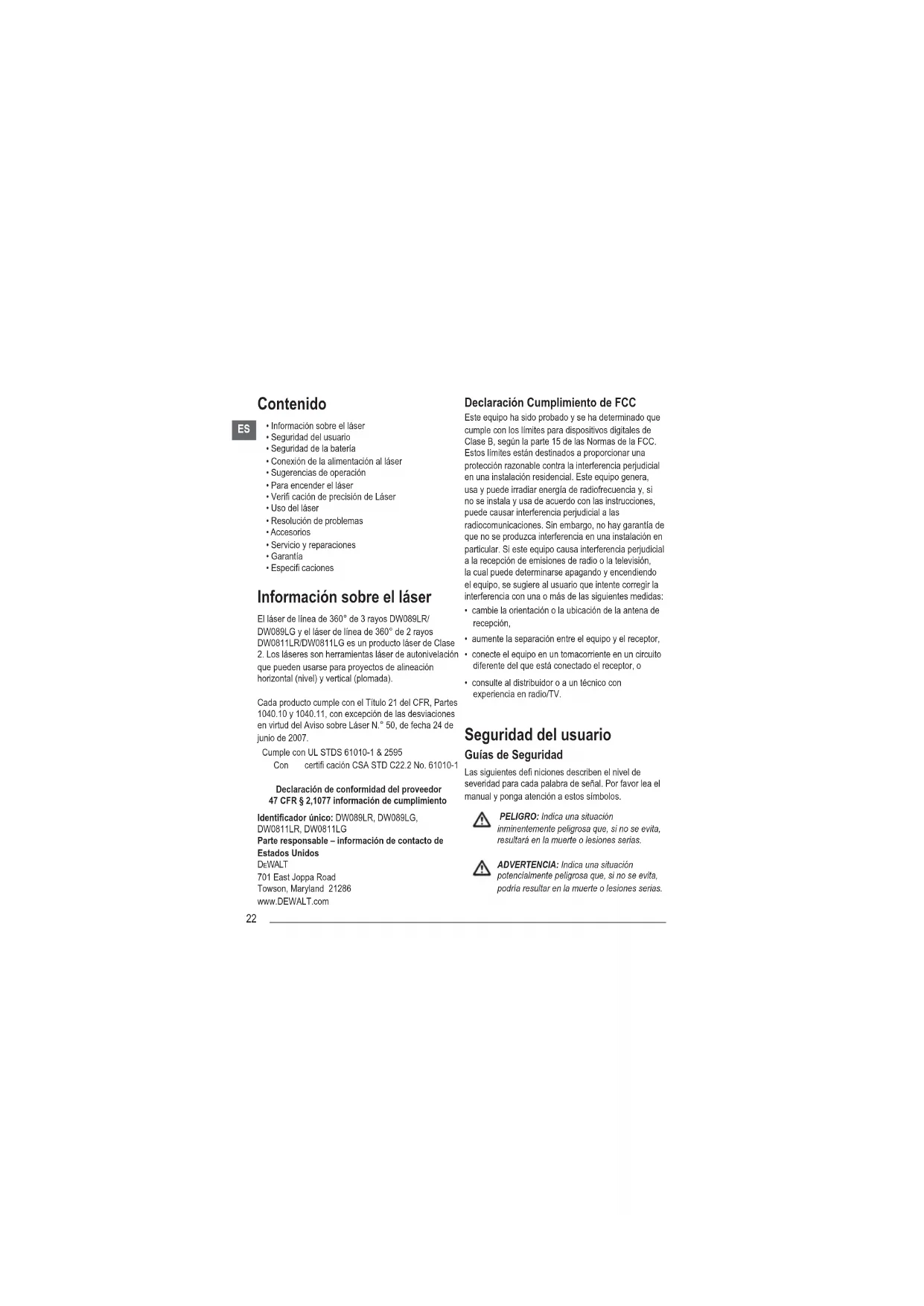que pueden usarse para proyectos de alineación horizontal (nivel) y vertical (plomada). Cada producto cumple con el Título 21 del CFR, Partes 1040.10 y 1040.11, con excepción de las desviaciones en virtud del Aviso sobre Láser N.° 50, de fecha 24 de junio de 2007. Cumple con UL STDS 61010-1 & 2595 Con certifi cación CSA STD C22.2 No. 61010-1 Declaración de conformidad del proveedor 47 CFR § 2,1077 información de cumplimiento Identifi cador único: DW089LR, DW089LG, DW0811LR, DW0811LG Parte responsable – información de contacto de Estados Unidos