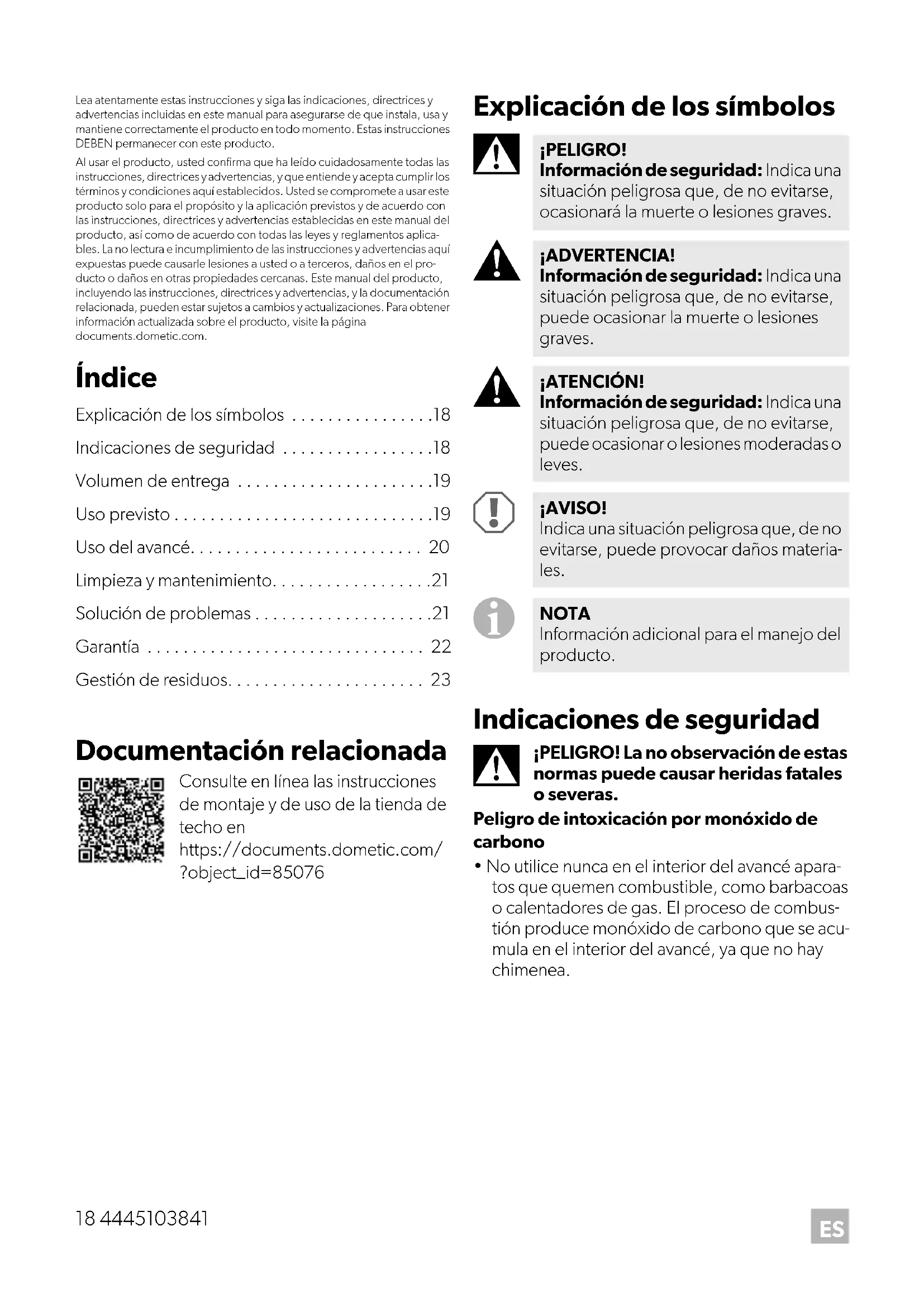 - Lea atentamente estas instrucciones y siga las indicaciones, directrices y advertencias incluidas en este manual para asegurarse de que instala, usa y mantiene correctamente el producto en todo momento. Estas instrucciones DEBEN permanecer con este producto.Al usar el producto, usted confirma que ha leído cuidadosamente todas las instrucciones, directrices y advertencias, y que entiende y acepta cumplir los términos y condiciones aquí establecidos. Usted se compromete a usar este producto solo para el propósito y la aplicación previstos y de acuerdo con las instrucciones, directrices y advertencias establecidas en este manual del producto, así como de acuerdo con todas las leyes y reglamentos aplica- bles. La no lectura e incumplimiento de las instrucciones y advertencias aquí expuestas puede causarle lesiones a usted o a terceros, daños en el pro-ducto o daños en otras propiedades cercanas. Este manual del producto, incluyendo las instrucciones, directrices y advertencias, y la documentación relacionada, pueden estar sujetos a cambios y actualizaciones. Para obtener información actualizada sobre el producto, visite la página documents.dometic.com. Índice Explicación de los símbolos p. 18