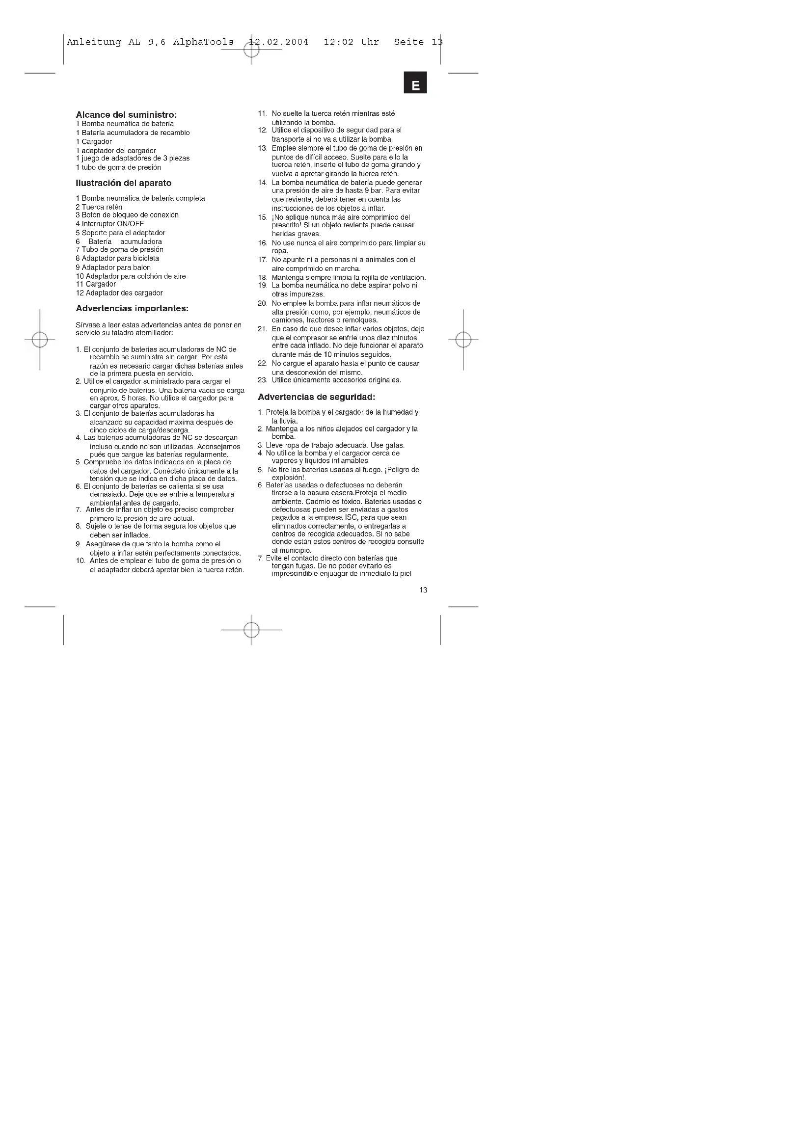 tengan fugas. De no poder evitarlo es imprescindible enjuagar de inmediato la piel Anleitung AL 9,6 AlphaTools 12.02.2004 12:02 Uhr Seite 13afectada con agua y jabón. Si el ácido que contiene la batería penetrase en los ojos, se enjuagarán al menos 10 minutos con agua limpia, consultando luego el médico de inmediato.