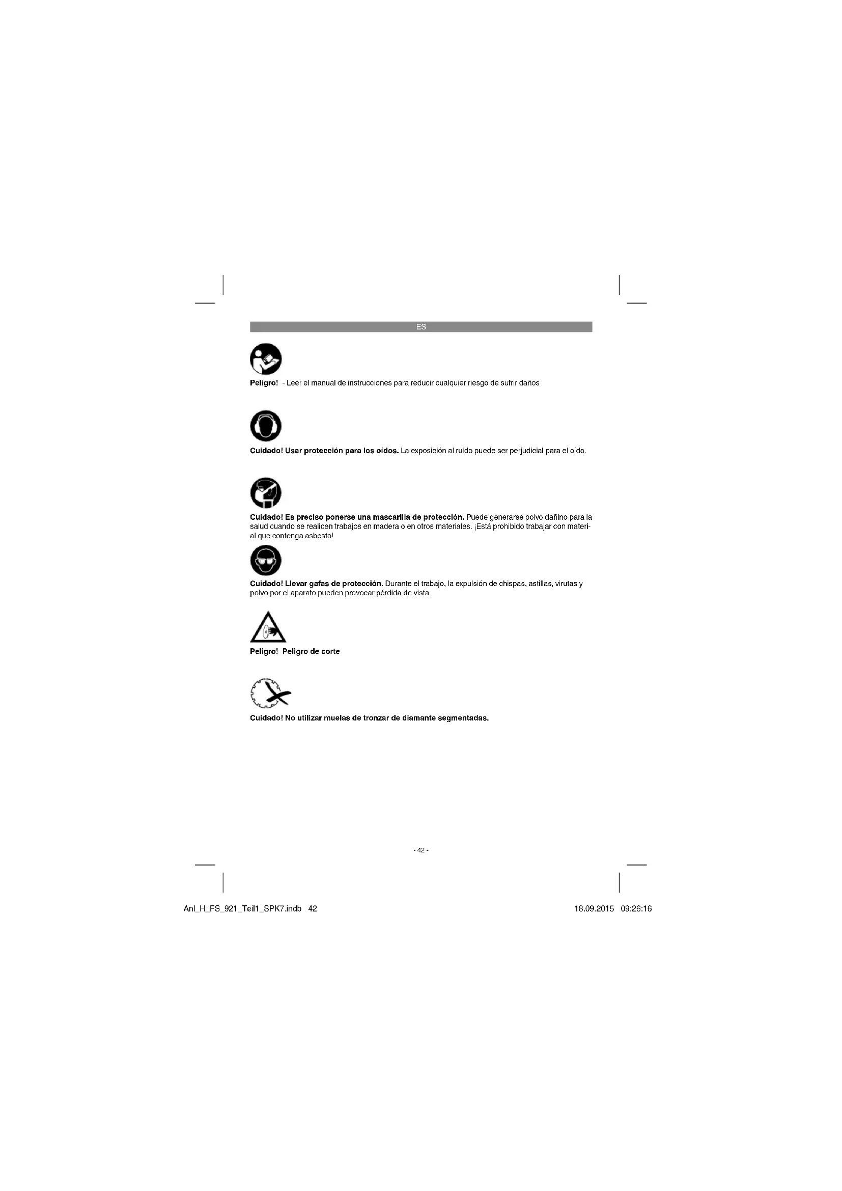 Peligro! Peligro de corte Cuidado! No utilizar muelas de tronzar de diamante segmentadas. Peligro! - Leer el manual de instrucciones para reducir cualquier riesgo de sufrir daños Cuidado! Usar protección para los oídos. La exposición al ruido puede ser perjudicial para el oído. Cuidado! Llevar gafas de protección. Durante el trabajo, la expulsión de chispas, astillas, virutas y polvo por el aparato pueden provocar pérdida de vista. Cuidado! Es preciso ponerse una mascarilla de protección. Puede generarse polvo dañino para la salud cuando se realicen trabajos en madera o en otros materiales. ¡Está prohibido trabajar con materi- al que contenga asbesto! Anl_H_FS_921_Teil1_SPK7.indb 42Anl_H_FS_921_Teil1_SPK7.indb 42 18.09.2015 09:26:1618.09.2015 09:26:16ES