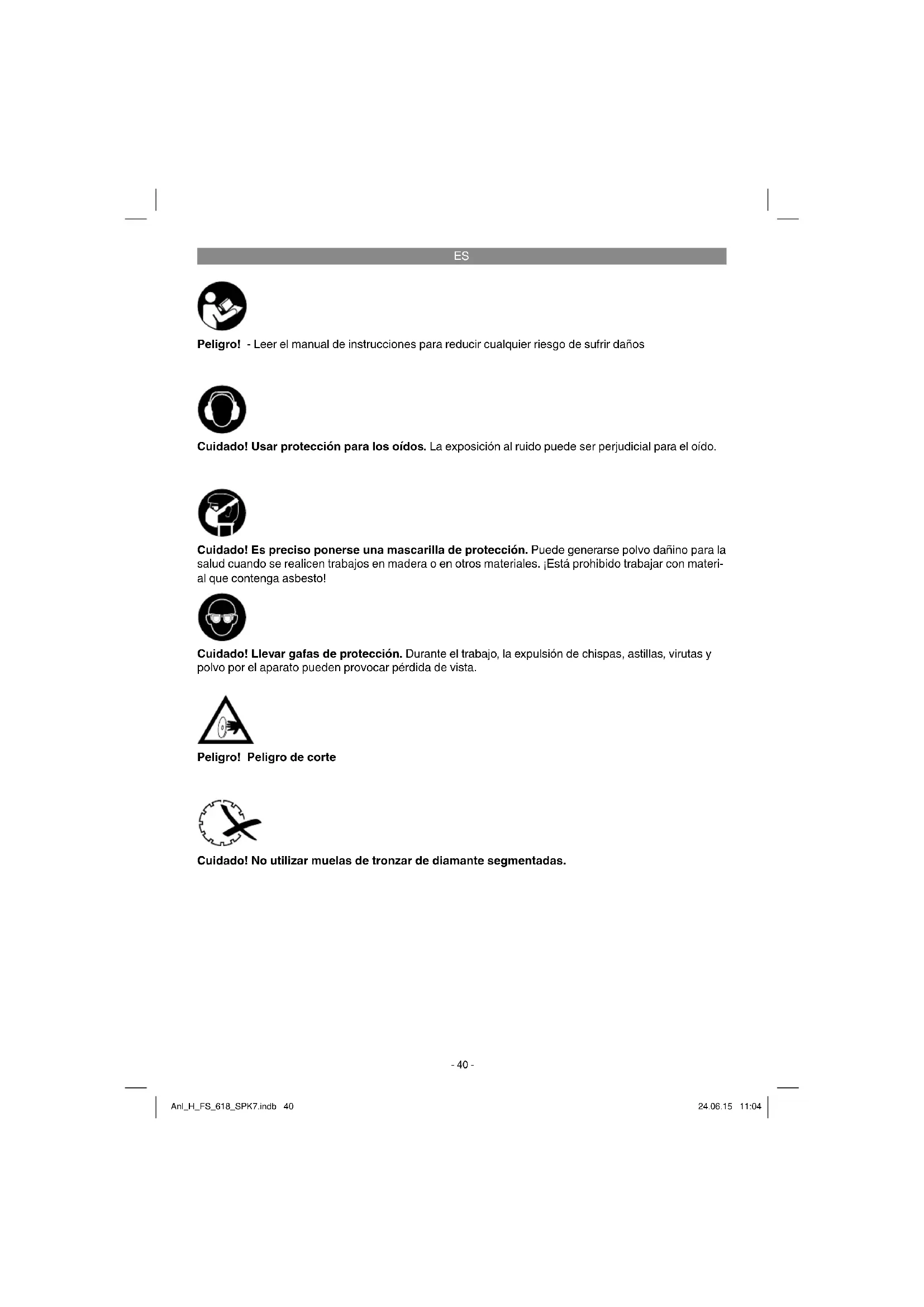 Peligro! Peligro de corte Cuidado! No utilizar muelas de tronzar de diamante segmentadas. Peligro! - Leer el manual de instrucciones para reducir cualquier riesgo de sufrir daños Cuidado! Usar protección para los oídos. La exposición al ruido puede ser perjudicial para el oído. Cuidado! Llevar gafas de protección. Durante el trabajo, la expulsión de chispas, astillas, virutas y polvo por el aparato pueden provocar pérdida de vista. Cuidado! Es preciso ponerse una mascarilla de protección. Puede generarse polvo dañino para la salud cuando se realicen trabajos en madera o en otros materiales. ¡Está prohibido trabajar con materi- al que contenga asbesto! Anl_H_FS_618_SPK7.indb 40Anl_H_FS_618_SPK7.indb 40 24.06.15 11:0424.06.15 11:04ES