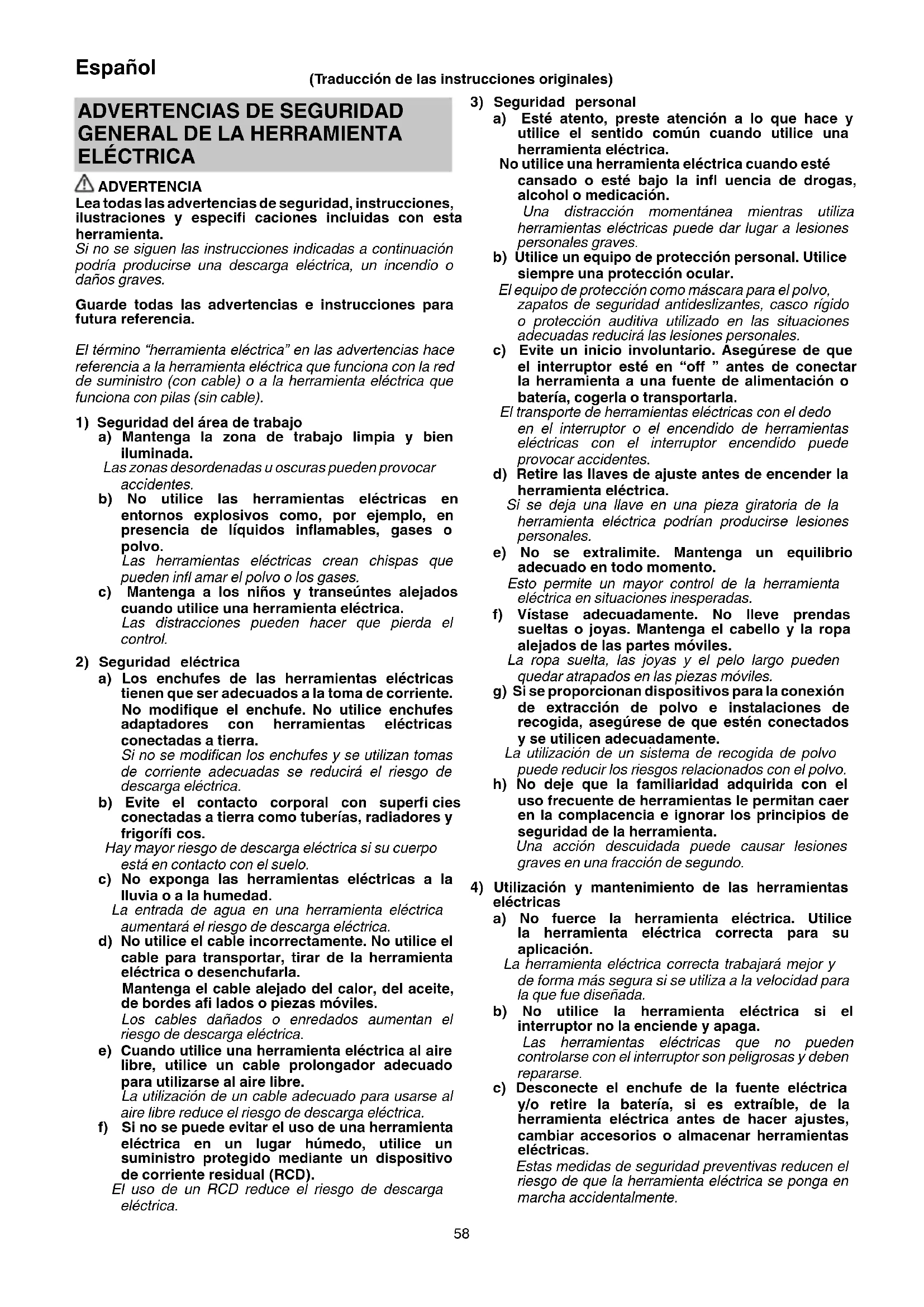 a) Los enchufes de las herramientas eléctricas tienen que ser adecuados a la toma de corriente. No modifi que el enchufe. No utilice enchufes adaptadores con herramientas eléctricas conectadas a tierra. Si no se modifi can los enchufes y se utilizan tomas de corriente adecuadas se reducirá el riesgo de descarga eléctrica. b) Evite el contacto corporal con superfi cies conectadas a tierra como tuberías, radiadores y frigorífi cos. Hay mayor riesgo de descarga eléctrica si su cuerpo está en contacto con el suelo. c) No exponga las herramientas eléctricas a la lluvia o a la humedad. La entrada de agua en una herramienta eléctrica aumentará el riesgo de descarga eléctrica. d) No utilice el cable incorrectamente. No utilice el cable para transportar, tirar de la herramienta eléctrica o desenchufarla. Mantenga el cable alejado del calor, del aceite, de bordes afi lados o piezas móviles. Los cables dañados o enredados aumentan el riesgo de descarga eléctrica. e) Cuando utilice una herramienta eléctrica al aire libre, utilice un cable prolongador adecuado para utilizarse al aire libre. La utilización de un cable adecuado para usarse al aire libre reduce el riesgo de descarga eléctrica. f) Si no se puede evitar el uso de una herramienta eléctrica en un lugar húmedo, utilice un suministro protegido mediante un dispositivo de corriente residual (RCD). El uso de un RCD reduce el riesgo de descarga eléctrica. (Traducción de las instrucciones originales) 0000BookDS18DC.indb580000BookDS18DC.indb58 2022/10/1618:24:572022/10/1618:24:5759 Español d) Guarde las herramientas eléctricas que no se utilicen fuera del alcance de los niños, y no permita que utilicen las herramientas eléctricas personas no familiarizadas con las mismas o con estas instrucciones. Las herramientas eléctricas son peligrosas si son utilizadas por usuarios sin formación. e) Realice el mantenimiento de las herramientas eléctricas y accesorios. Compruebe si las piezas móviles están mal alineadas o unidas, si hay alguna pieza rota u otra condición que pudiera afectar al funcionamiento de las herramientas eléctricas. Si la herramienta eléctrica está dañada, llévela a reparar antes de utilizarla. Se producen muchos accidentes por no realizar un mantenimiento correcto de las herramientas eléctricas. f) Mantenga las herramientas de corte afi ladas y limpias. Las herramientas de corte correctamente mantenidas con los bordes de corte afi lados son más fáciles de controlar, y existe menor riesgo de que se atasquen. g) Utilice la herramienta eléctrica, los accesorios y las brocas de la herramienta, etc. de acuerdo con estas instrucciones, teniendo en cuenta las condiciones de trabajo y el trabajo que se va a realizar. La utilización de la herramienta eléctrica para operaciones diferentes a las previstas podría dar lugar a una situación peligrosa. h) Mantenga los mangos y las superfi cies de agarre secas, limpias y libres de aceite y grasa. Los mangos y las superfi cies de agarre resbaladizos no permiten el manejo y el control seguros de la herramienta en situaciones inesperadas.