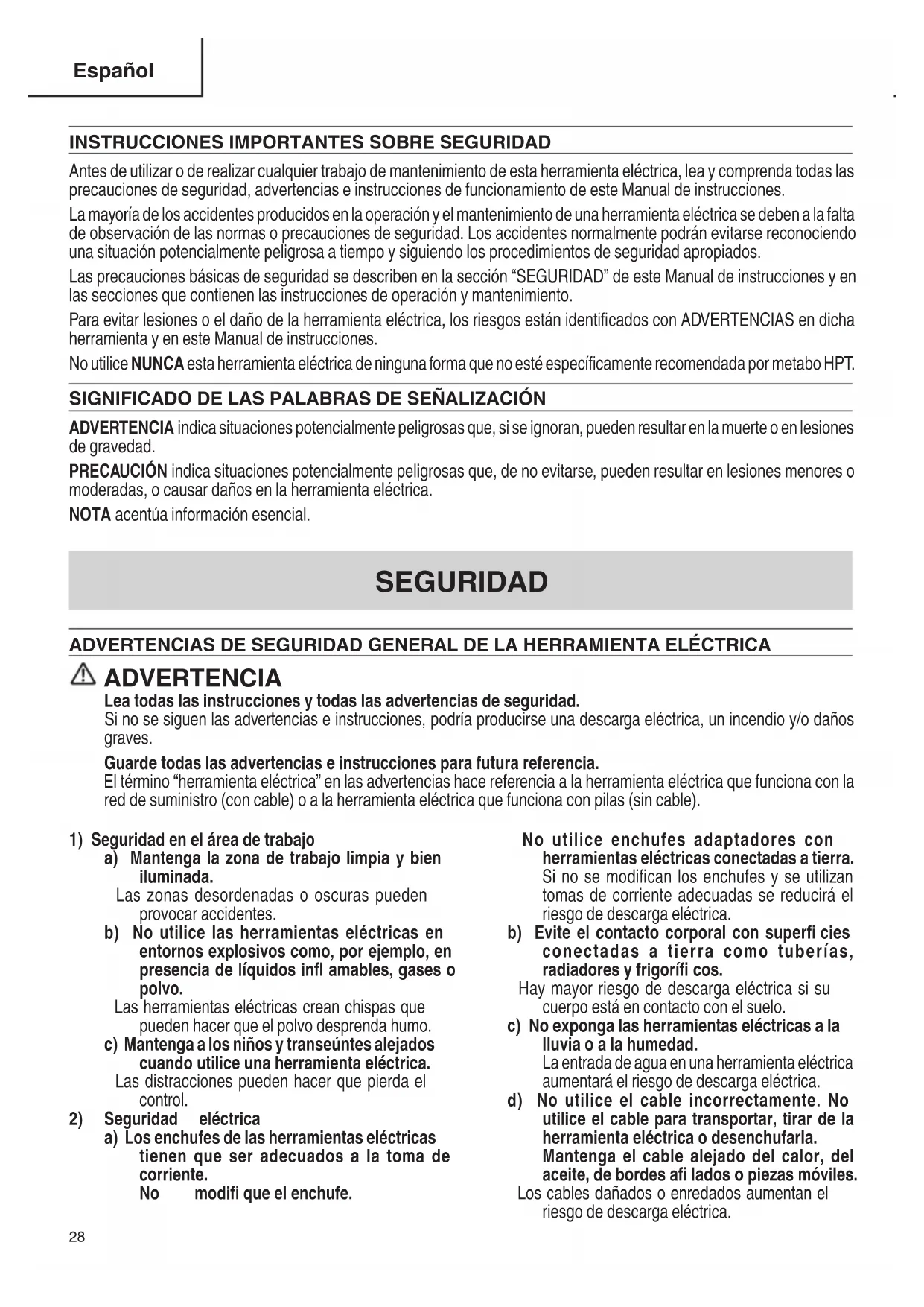 Antes de utilizar o de realizar cualquier trabajo de mantenimiento de esta herramienta eléctrica, lea y comprenda todas las precauciones de seguridad, advertencias e instrucciones de funcionamiento de este Manual de instrucciones. La mayoría de los accidentes producidos en la operación y el mantenimiento de una herramienta eléctrica se deben a la falta de observación de las normas o precauciones de seguridad. Los accidentes normalmente podrán evitarse reconociendo una situación potencialmente peligrosa a tiempo y siguiendo los procedimientos de seguridad apropiados. Las precauciones básicas de seguridad se describen en la sección “SEGURIDAD” de este Manual de instrucciones y en las secciones que contienen las instrucciones de operación y mantenimiento. Para evitar lesiones o el daño de la herramienta eléctrica, los riesgos están identifi cados con ADVERTENCIAS en dicha herramienta y en este Manual de instrucciones. No utilice NUNCA esta herramienta eléctrica de ninguna forma que no esté específi camente recomendada por metabo HPT. SIGNIFICADO DE LAS PALABRAS DE SEÑALIZACIÓN ADVERTENCIA indica situaciones potencialmente peligrosas que, si se ignoran, pueden resultar en la muerte o en lesiones de gravedad. PRECAUCIÓN indica situaciones potencialmente peligrosas que, de no evitarse, pueden resultar en lesiones menores o moderadas, o causar daños en la herramienta eléctrica. NOTA acentúa información esencial.