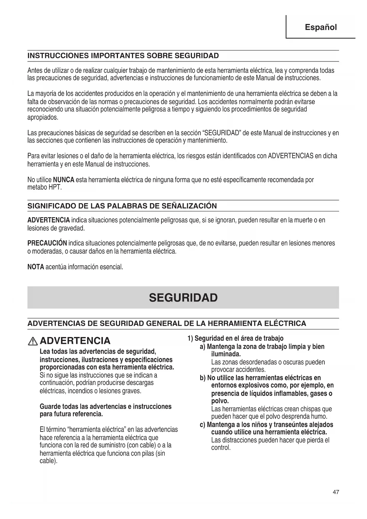 Antes de utilizar o de realizar cualquier trabajo de mantenimiento de esta herramienta eléctrica, lea y comprenda todas las precauciones de seguridad, advertencias e instrucciones de funcionamiento de este Manual de instrucciones. La mayoría de los accidentes producidos en la operación y el mantenimiento de una herramienta eléctrica se deben a la falta de observación de las normas o precauciones de seguridad. Los accidentes normalmente podrán evitarse reconociendo una situación potencialmente peligrosa a tiempo y siguiendo los procedimientos de seguridad apropiados. Las precauciones básicas de seguridad se describen en la sección “SEGURIDAD” de este Manual de instrucciones y en las secciones que contienen las instrucciones de operación y mantenimiento. Para evitar lesiones o el daño de la herramienta eléctrica, los riesgos están identificados con ADVERTENCIAS en dicha herramienta y en este Manual de instrucciones. No utilice NUNCA esta herramienta eléctrica de ninguna forma que no esté específicamente recomendada por metaboHPT. SIGNIFICADO DE LAS PALABRAS DE SEÑALIZACIÓN ADVERTENCIA indica situaciones potencialmente peligrosas que, si se ignoran, pueden resultar en la muerte o en lesiones de gravedad. PRECAUCIÓN indica situaciones potencialmente peligrosas que, de no evitarse, pueden resultar en lesiones menores o moderadas, o causar daños en la herramienta eléctrica. NOTA acentúa información esencial. SEGURIDAD ADVERTENCIAS DE SEGURIDAD GENERAL DE LA HERRAMIENTA ELÉCTRICA ADVERTENCIA Lea todas las advertencias de seguridad, instrucciones, ilustraciones y especificaciones proporcionadas con esta herramienta eléctrica. Si no sigue las instrucciones que se indican a continuación, podrían producirse descargas eléctricas, incendios o lesiones graves. Guarde todas las advertencias e instrucciones para futura referencia. El término “herramienta eléctrica” en las advertencias hace referencia a la herramienta eléctrica que funciona con la red de suministro (con cable) o a la herramienta eléctrica que funciona con pilas (sin cable).