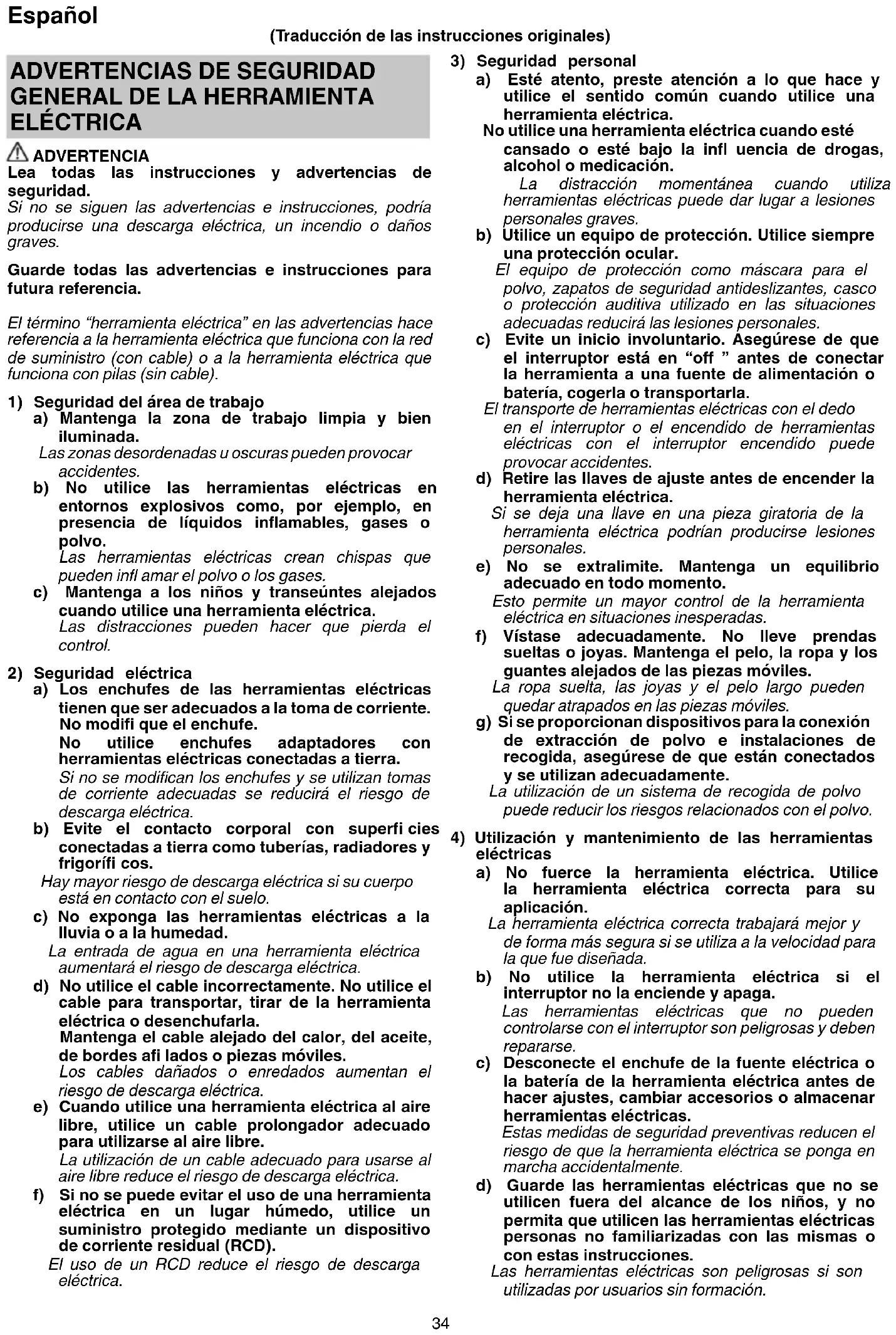 ELÉCTRICA ADVERTENCIA Lea todas las instrucciones y advertencias de seguridad. Si no se siguen las advertencias e instrucciones, podría producirse una descarga eléctrica, un incendio o daños graves. Guarde todas las advertencias e instrucciones para futura referencia. El término “herramienta eléctrica” en las advertencias hace referencia a la herramienta eléctrica que funciona con la red de suministro (con cable) o a la herramienta eléctrica que funciona con pilas (sin cable).