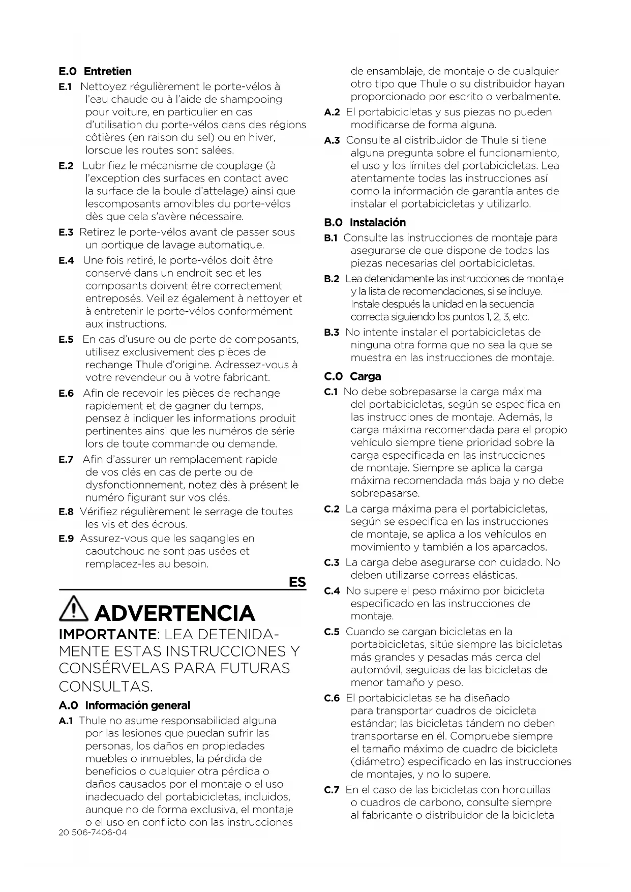 - 10 grados por encima y 5 por debajo del eje horizontal Si no se cumplen estos límites, debe instalarse una luz de freno de reemplazo opcional. Debe tenerse en cuenta la legislación nacional cuando se utilice el portabicicletas. C.14 Conserve las instrucciones de montaje y de seguridad, y (si procede) el tipo de aprobación de la CE en el vehículo mientras el portabicicletas esté montado. C.15 No está diseñado para tándems ni bicicletas reclinadas. C.16 No instalar en un trailer ni otro vehículo a remolque. C.17 Este producto no está destinado para su uso en ningún vehículo recreativo. D.0 Normativas y características de conducción D.1 Este producto está destinado para su uso en carreteras públicas y privadas, incluyendo caminos de terracería, caminos de servicio forestal y caminos de acceso. Otro uso y manejo fuera de carretera se realiza bajo la responsabilidad del usuario y no está cubierto por la garantía. Adapta tu velocidad a las condiciones de la carretera y la carga que estás llevando. Compruebe con regularidad las sujeciones de la carga. D.2 El conductor del vehículo es el único responsable de comprobar que el portabicicletas está en buen estado y que tanto el portabicicletas como la carga están debidamente sujetos (aunque lo haya montado una tercera persona). D.3 Cada vez que utilice el portabicicletas, compruebe que está bien sujeto tras conducir una distancia corta (50 km) y a intervalos periódicos a partir de entonces. Si nota algún ruido fuera de lo normal, movimiento de la carga o del portabicicletas, comportamiento distinto del vehículo o cualquier otra cosa poco común, deténgase y compruebe que el portabicicletas y la carga están sujetos con seguridad según las instrucciones de montaje. D.4 La longitud y/o el peso total del vehículo puede incrementarse al instalar un portabicicletas. Las bicicletas también pueden aumentar la anchura y el peso total del vehículo. Tenga especial cuidado al conducir marcha atrás o al entrar en garajes, ferries, etc. D.5 Sustituya inmediatamente las piezas del portabicicletas que estén deterioradas o gastadas. Durante el transporte, deben apretarse bien todas las palancas, pernos o tuercas de conformidad con las instrucciones de montaje. D.6 Los portabicicletas equipados con un cierre deben estar siempre en la posición de bloqueados. Las llaves se pueden quitar y guardar en el vehículo durante el transporte. D.7 Tenga en cuenta que las características de conducción y el comportamiento de frenado del vehículo (también en curvas) podrían cambiar y el que el vehículo podría verse afectado por ráfagas de viento laterales cuando el portabicicletas está instalado. D.8 En función del modelo de portabicicletas, las luces del portón trasero podrían quedar tapadas. Si este es el caso yelportabicicletas no tiene luces traseras incorporadas, debeinstalarse una placa de luces externa.22 506-7406-04D.9 Se podría necesitar una placa de matrícula adicional, que deberá colocarse en la parte adecuada del portabicicletas de conformidad con la legislación local. D.10 La velocidad del vehículo debe ajustarse siempre a la carga que se transporta y a las condiciones de conducción en cada momento como, por ejemplo, el tipo de carretera, el estado de la misma, el viento, la intensidad del tráfico y los límites de velocidad aplicables, aunque en ningún caso debe superar los 130 km/h. Siempre deben respetarse los límites de velocidad aplicables y las demás normativas de tráfico. D.11 Conduzca lentamente cuando haya bandas reductoras de velocidad, máximo 10 km/h. D.12 Tenga en cuenta que el viento podría generar ruido durante el transporte, un ruido que variará según el vehículo y la carga. D.13 Por motivos de ahorro de combustible e impacto medioambiental, además de la seguridad de los demás usuarios de la carretera, el portabicicletas debe retirarse del vehículo cuando no se utilice. E.0 Mantenimiento E.1 Limpie con regularidad el portabicicletas utilizando agua templada o champú para coche, especialmente cuando el portabicicletas se utilice, o se haya utilizado, en zonas costeras (efecto del agua salada) o durante los periodos en que se echa sal en las carreteras (invierno). E.2 Lubrique el mecanismo de acoplamiento (pero no las superficies que están en contacto con la superficie de la bola de remolque) ydemás piezas móviles del portabicicletas cuando sea necesario. E.3 Retire el portabicicletas si va a utilizar un lavado automáticos de coches. E.4 Cuando se retira el portabicicletas del automóvil, hay que guardarlo en un lugar seco. Todos los componentes del portabicicletas deben guardarse de forma segura. No olvide limpiar y conservar el portabicicletas según las instrucciones. E.5 En caso de pérdida o desgaste de alguna pieza del portabicicletas, utilice únicamente repuestos genuinos Thule para sustituirlas. Puede adquirir los recambios en su distribuidor o en el fabricante. E.6 Para asegurarse de recibir los recambios rápidamente y evitar consultas que llevan mucho tiempo, facilite los detalles del producto y el número de serie cuando haga un pedido o realice una consulta. E.7 Para conseguir rápidamente una llave de repuesto en caso depérdida o deterioro, aconsejamos anotar los números de la cerradura y de la llave que figuran en la llave. E.8 Comprobar periódicamente que todos los pernos y perillas estén bien apretados. E.9 Controle el buen estado de las correas y reemplácelas si están gastadas.