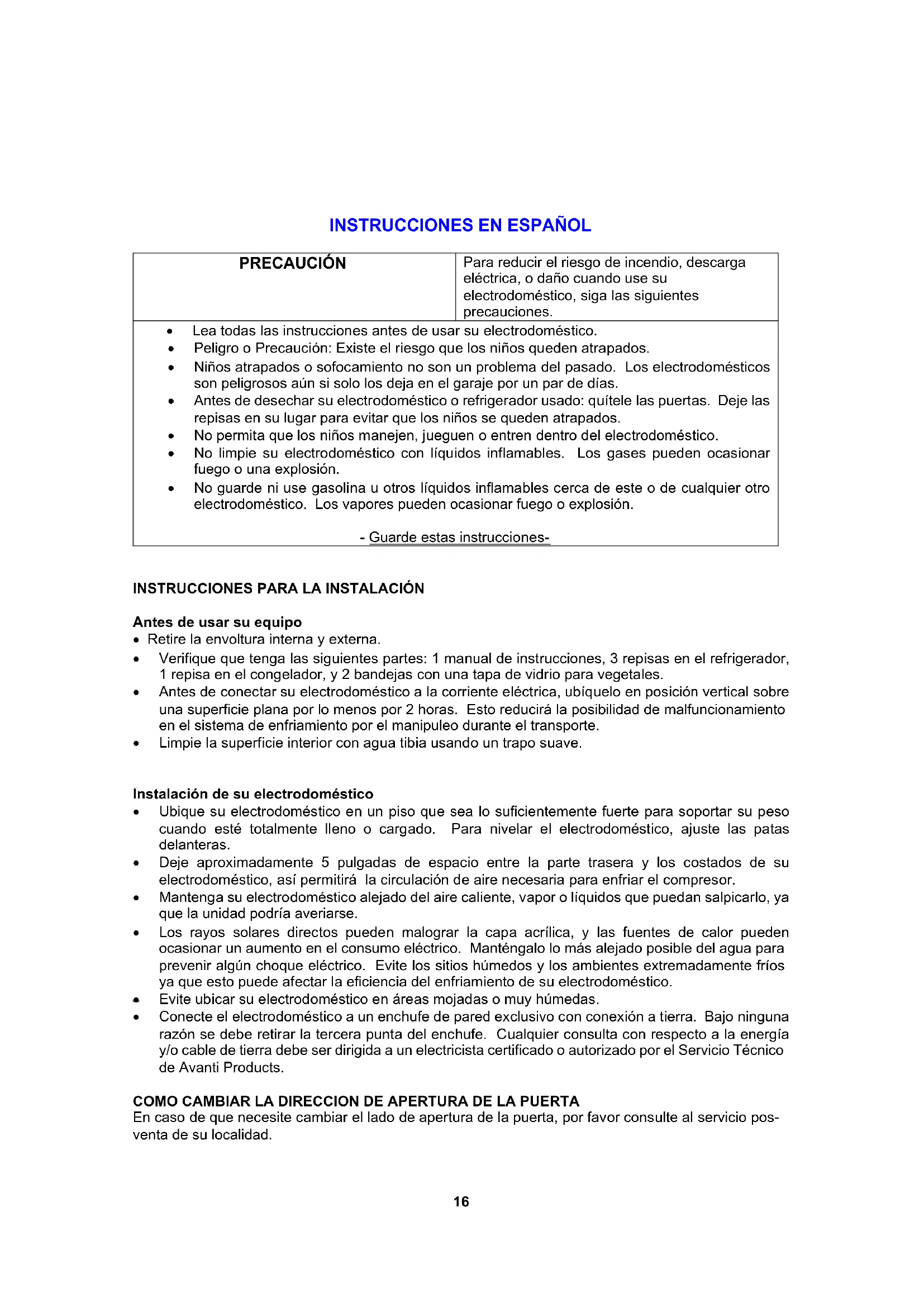 - Conecte el electrodoméstico a un enchufe de pared exclusivo con conexión a tierra. Bajo ninguna razón se debe retirar la tercera punta del enchufe. Cualquier consulta con respecto a la energía y/o cable de tierra debe ser dirigida a un electricista certificado o autorizado por el Servicio Técnico de Avanti Products. COMO CAMBIAR LA DIRECCION DE APERTURA DE LA PUERTA En caso de que necesite cambiar el lado de apertura de la puerta, por favor consulte al servicio pos- venta de su localidad.17 Conexión eléctrica
