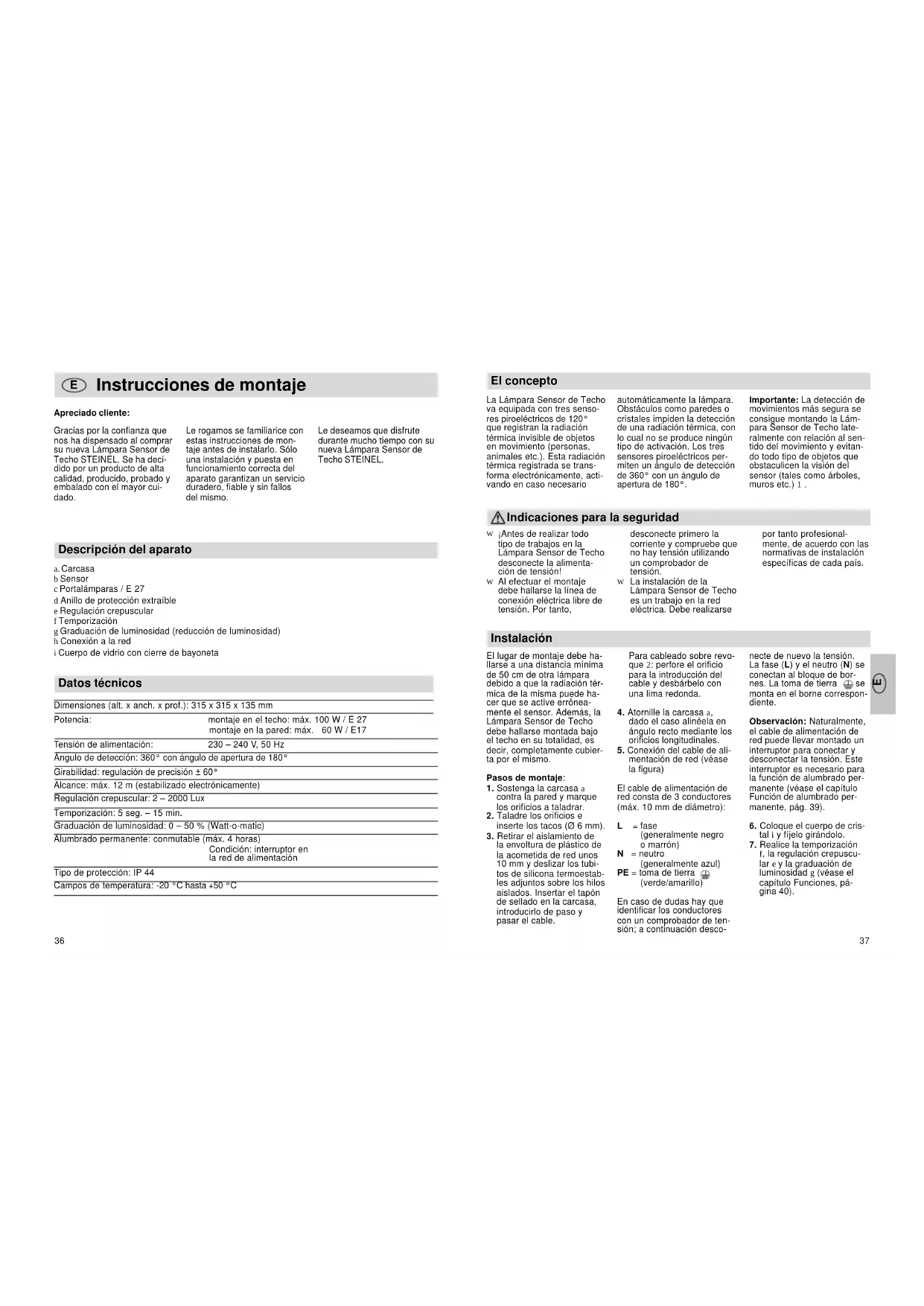 f, la regulación crepuscu- lar e y la graduación de luminosidad g (véase el capítulo Funciones, pá- gina 40). Dimensiones (alt. x anch. x prof.): 315 x 315 x 135 mm Potencia: montaje en el techo: máx. 100 W / E 27 montaje en la pared: máx. 60 W / E17 Tensión de alimentación: 230 – 240 V, 50 Hz Ángulo de detección: 360° con ángulo de apertura de 180° Girabilidad: regulación de precisión ± 60° Alcance: máx. 12 m (estabilizado electrónicamente) Regulación crepuscular: 2 – 2000 Lux Temporización: 5 seg. – 15 min. Graduación de luminosidad: 0 – 50 % (Watt-o-matic) Alumbrado permanente: conmutable (máx. 4 horas) Condición: interruptor en la red de alimentación Tipo de protección: IP 44 Campos de temperatura: -20 °C hasta +50 °C Instrucciones de montaje Apreciado cliente: Gracias por la confianza que nos ha dispensado al comprar su nueva Lámpara Sensor de Techo STEINEL. Se ha deci- dido por un producto de alta calidad, producido, probado y embalado con el mayor cui- dado. Le rogamos se familiarice con estas instrucciones de mon- taje antes de instalarlo. Sólo una instalación y puesta en funcionamiento correcta del aparato garantizan un servicio duradero, fiable y sin fallos del mismo. Descripción del aparato a. Carcasa b Sensor c Portalámparas / E 27 d Anillo de protección extraíble e Regulación crepuscular f Temporización g Graduación de luminosidad (reducción de luminosidad) h Conexión a la red i Cuerpo de vidrio con cierre de bayoneta Datos técnicos