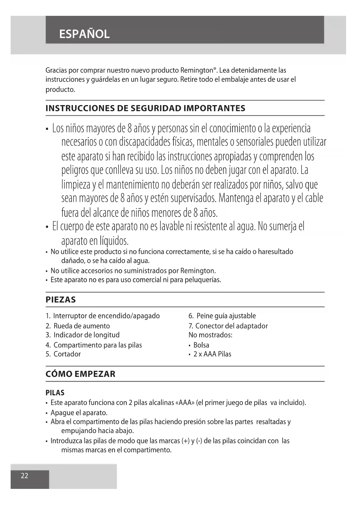 AE22 ESPAÑOL Gracias por comprar nuestro nuevo producto Remington®. Lea detenidamente las instrucciones y guárdelas en un lugar seguro. Retire todo el embalaje antes de usar el producto.