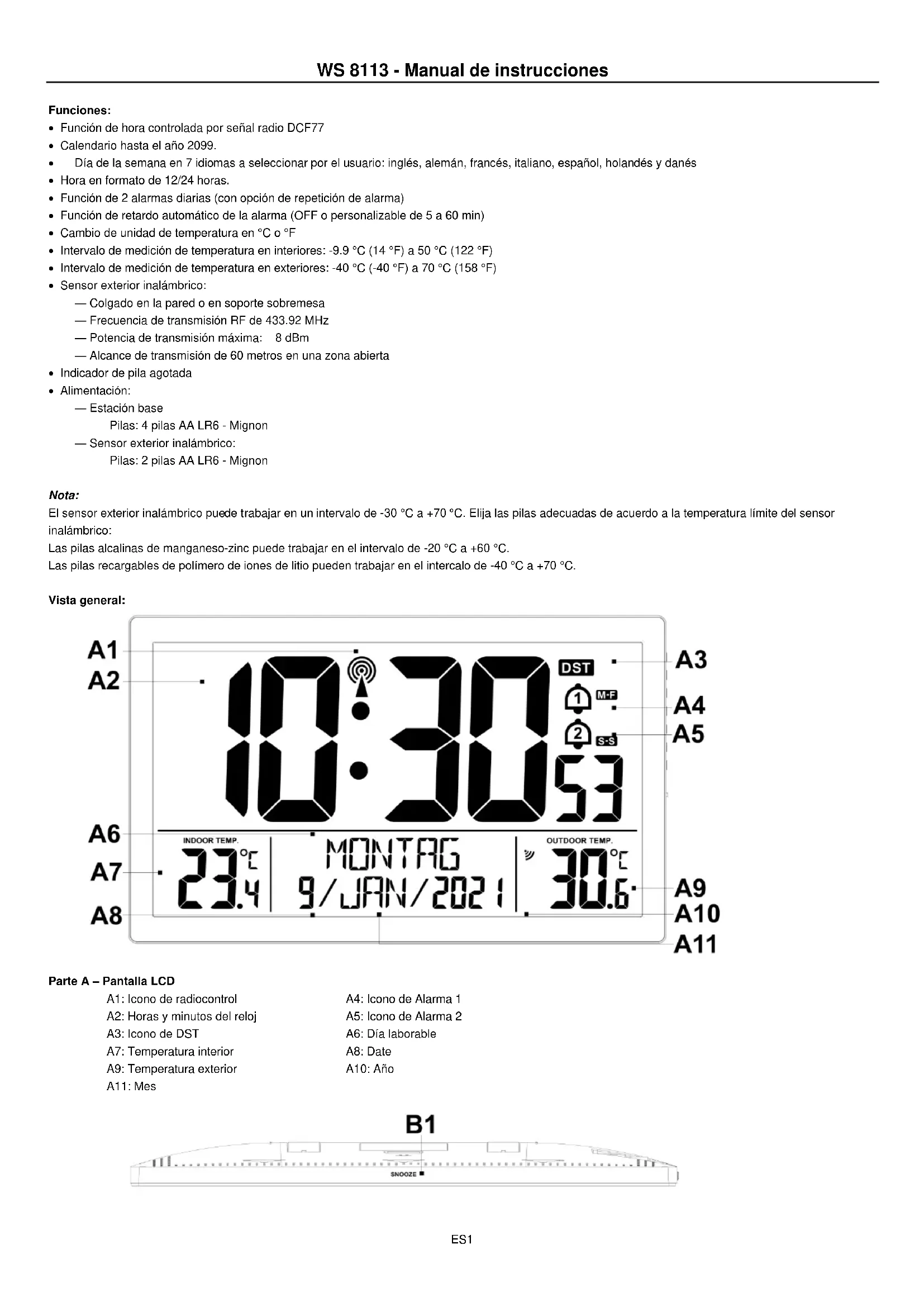 Séparez le carton d’emballage de tout sous carton éventuel en plastique. Tout bien trier conformément aux règlementations en matière de séparation des déchets.ES1 WS 8113 - Manual de instrucciones Funciones: Función de hora controlada por señal radio DCF77 Calendario hasta el año 2099. Día de la semana en 7 idiomas a seleccionar por el usuario: inglés, alemán, francés, italiano, español, holandés y danés Hora en formato de 12/24 horas. Función de 2 alarmas diarias (con opción de repetición de alarma) Función de retardo automático de la alarma (OFF o personalizable de 5 a 60 min) Cambio de unidad de temperatura en °C o °F Intervalo de medición de temperatura en interiores: -9.9 °C (14 °F) a 50 °C (122 °F) Intervalo de medición de temperatura en exteriores: -40 °C (-40 °F) a 70 °C (158 °F) Sensor exterior inalámbrico: — Colgado en la pared o en soporte sobremesa — Frecuencia de transmisión RF de 433.92 MHz — Potencia de transmisión máxima: 8 dBm — Alcance de transmisión de 60 metros en una zona abierta Indicador de pila agotada Alimentación: — Estación base Pilas: 4 pilas AA LR6 - Mignon — Sensor exterior inalámbrico: Pilas: 2 pilas AA LR6 - Mignon Nota: El sensor exterior inalámbrico puede trabajar en un intervalo de -30 °C a +70 °C. Elija las pilas adecuadas de acuerdo a la temperatura límite del sensor inalámbrico: Las pilas alcalinas de manganeso-zinc puede trabajar en el intervalo de -20 °C a +60 °C. Las pilas recargables de polímero de iones de litio pueden trabajar en el intercalo de -40 °C a +70 °C. Vista general: