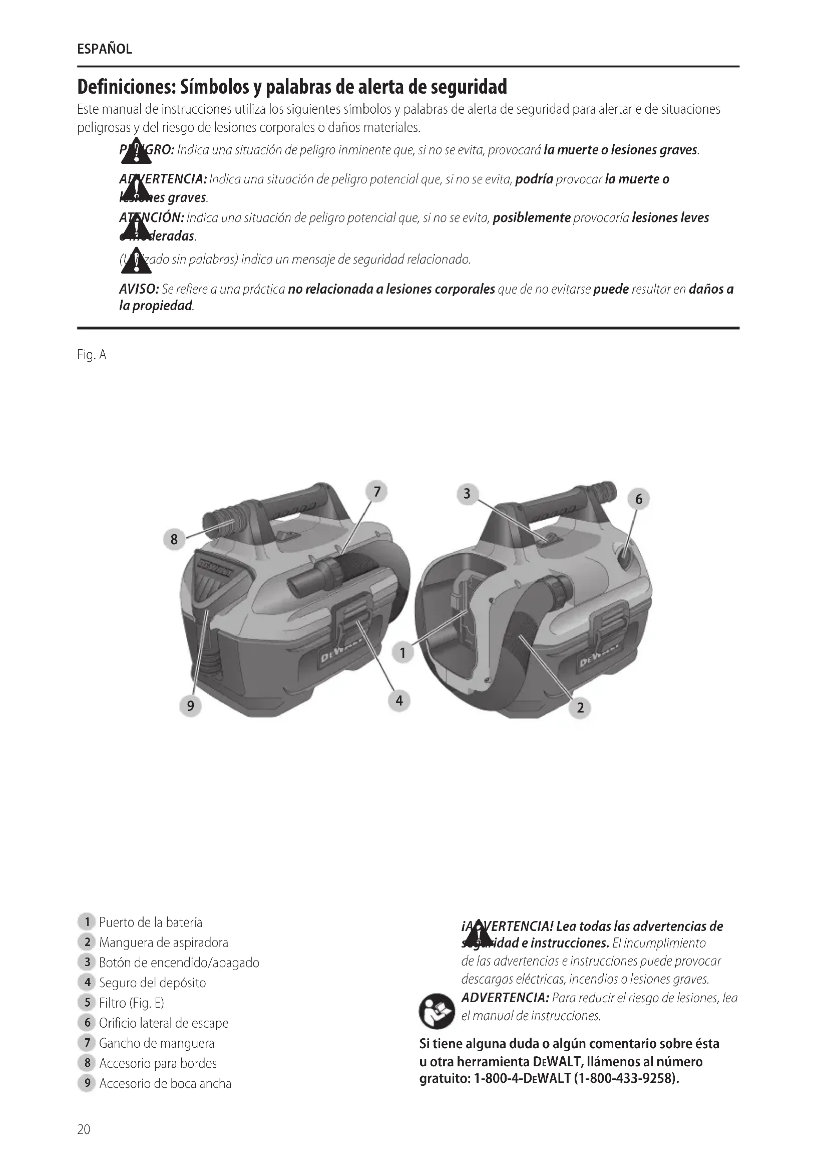- No intente repararla. Las reparaciones, el mantenimiento y los ajustes del dispositivo deberán ser realizados por centros de servicio DeWALTautorizados. Almacenamiento de la Manguera y Accesorios (Fig.A) Cuando la aspiradora no esté en funcionamiento, la manguera puede enrollarse en el aparato, por debajo de la interfaz de la batería, y fijarse con el gancho de la manguera