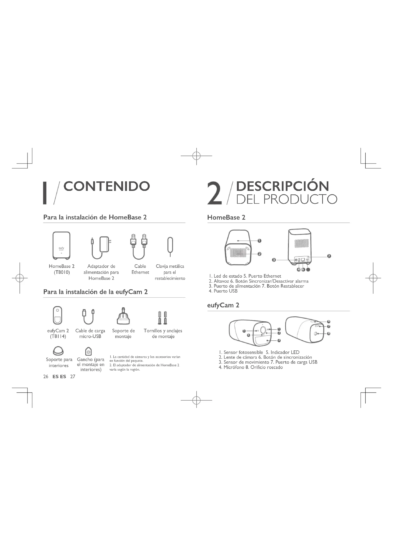 Montaje de la cámara Carga de la eufycam 226 ES ES 27 CONTENIDO Para la instalación de HomeBase2 HomeBase 2 (T8010) Adaptador de alimentación para HomeBase 2 Cable Ethernet Clavija metálica para el restablecimiento Para la instalación de la eufyCam2 eufyCam 2 (T8114) Cable de carga micro-USB Soporte de montaje Tornillos y anclajes de montaje DESCRIPCIÓN DEL PRODUCTO HomeBase 2