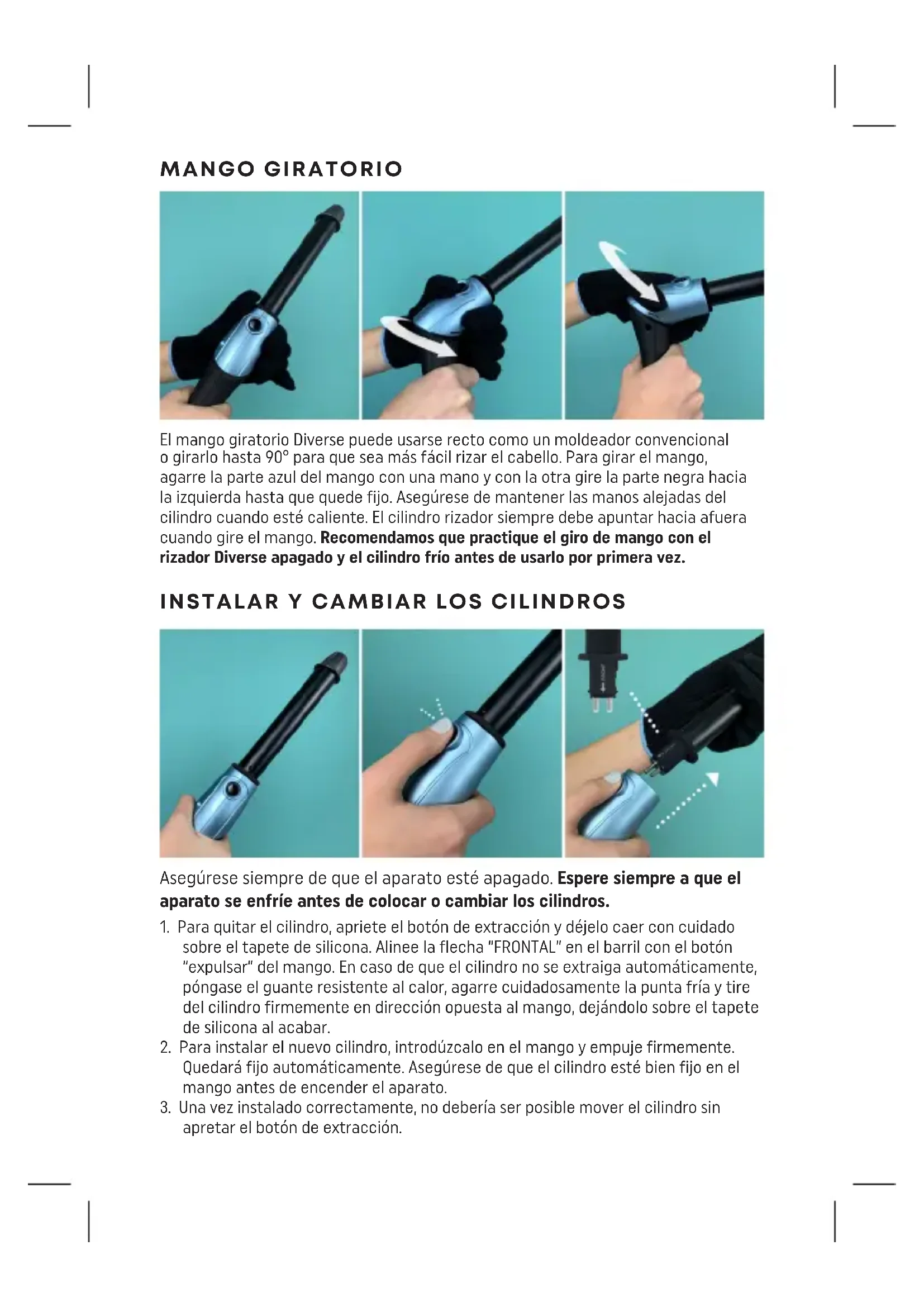 Este aparato puede ser usado por adultos y niños mayores de 16 años. Las personas con discapacidades físicas, mentales o sensoriales no deberían usar este producto. Las personas sin conocimiento ni experiencia pueden utilizar este aparato si han recibido instrucciones o están supervisados y comprenden los peligros que conlleva su uso. Los niños no deben jugar con el aparato. Los niños no deben realizar la limpieza y el mantenimiento, excepto si son mayores de 16 años y están supervisados. Mantenga el aparato y el cable fuera del alcance de los niños menores de 16 años.ADVERTENCIA: para mayor protección, se aconseja la instalación de un dispositivo de corriente residual (RCD) con una corriente de funcionamiento residual nominal no superior a 30 mA. Si lo necesita, consulte con un electricista. Antes de enchufar el aparato a una toma de corriente, asegúrese de que la tensión sea igual a la tensión indicada en el aparato. Tras su uso, SIEMPRE APAGUE EL APARATO Y DESENCHÚFELO DE LA TOMA DE CORRIENTE. Deje que se enfríe en un lugar seguro fuera del alcance de los niños. No deje el aparato donde los niños puedan tocarlo para evitar riesgos de lesión. Tras su uso, el cilindro puede tardar hasta una hora en alcanzar una temperatura segura. ADVERTENCIA: Este aparato no debe usarse cerca del agua o en un cuao de baño. No lo use cerca de bañeras, lavabos u otros recipientes que contengan agua. EL MANGO Y LOS CILINDROS DIVERSE DE REVAMP ESTÁN DISEÑADOS PARA SER COMPATIBLES ÚNICAMENTE ENTRE SÍ. NO INTENTE COMBINARLOS CON OTROS PRODUCTOS.