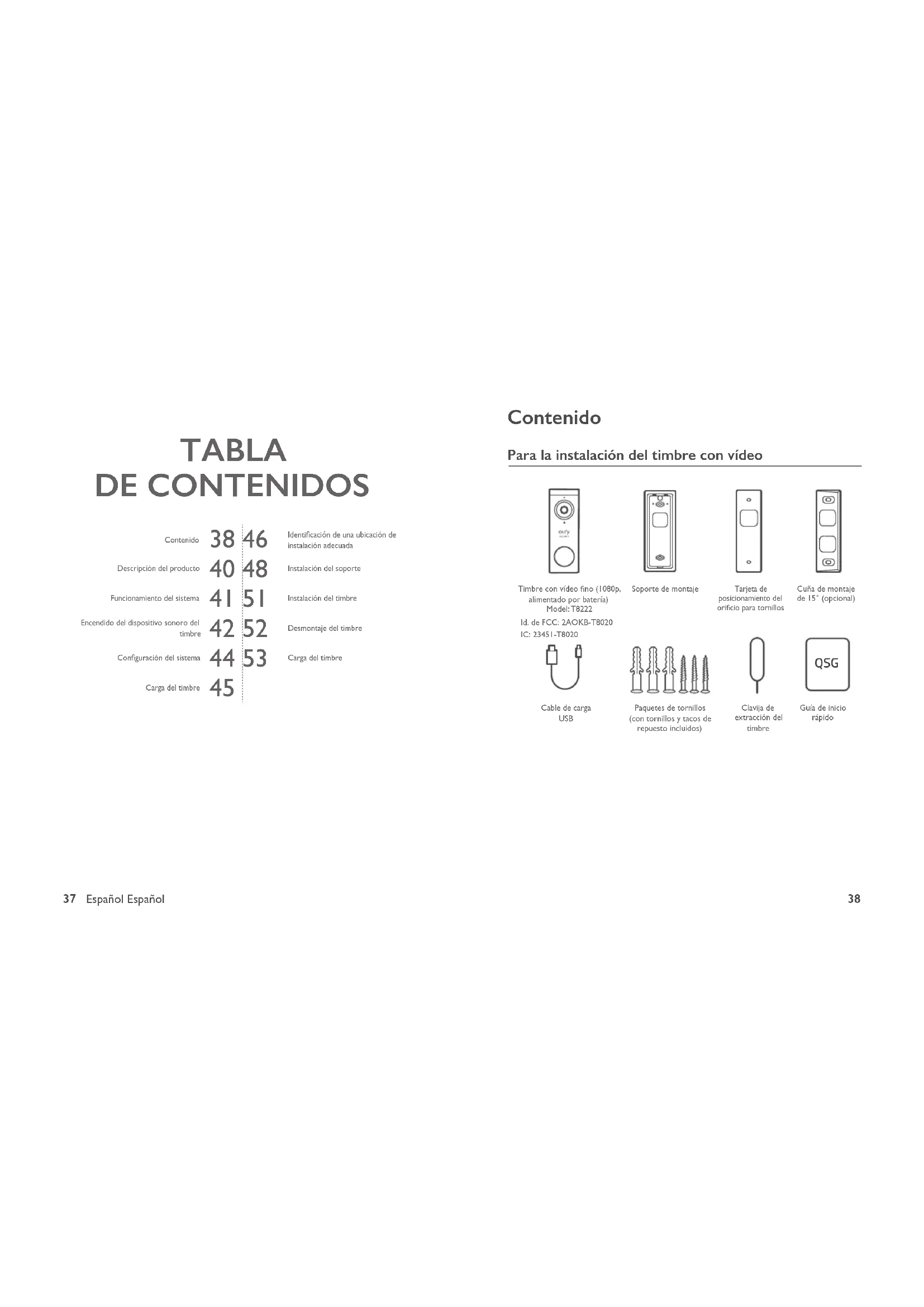 Contenido Para la instalación del timbre con vídeo QSG Timbre con vídeo no (1080p, alimentado por batería) Model: T8222Paquetes de tornillos (con tornillos y tacos de repuesto incluidos)Guía de inicio rápidoTarjeta de posicionamiento del oricio para tornillosClavija de extracción del timbreCuña de montaje de 15° (opcional)Soporte de montajeId. de FCC: 2AOKB-T8020IC: 23451-T8020Cable de carga USB39 Español Español