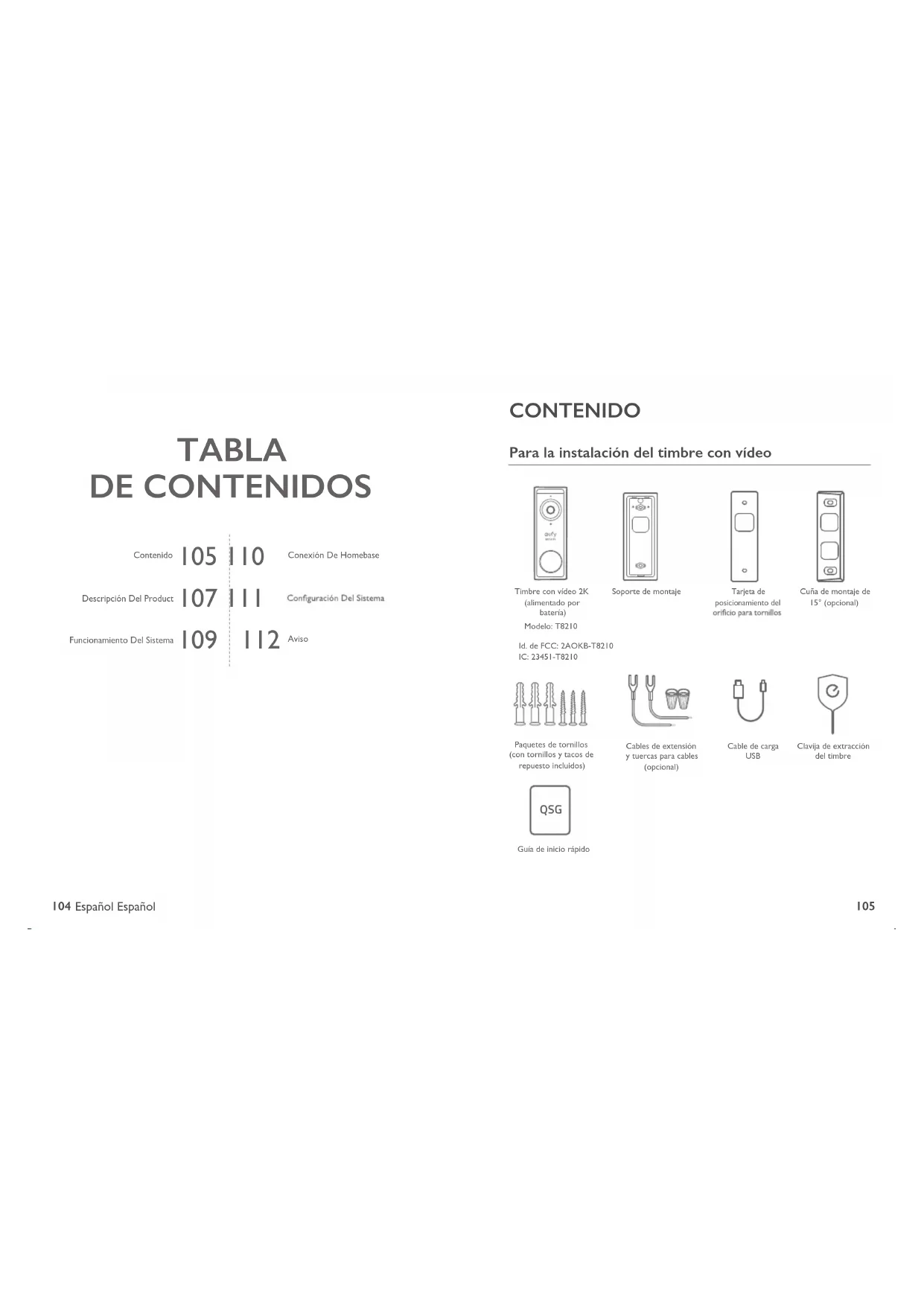 TABLA DE CONTENIDOS CONTENIDO Para la instalación del timbre con vídeo QSG Timbre con vídeo 2K (alimentado por batería)Modelo: T8210Paquetes de tornillos (con tornillos y tacos de repuesto incluidos)Guía de inicio rápidoTarjeta de posicionamiento del Clavija de extracción del timbreCuña de montaje de 15° (opcional) Soporte de montaje Cables de extensión y tuercas para cables (opcional)Id. de FCC: 2AOKB-T8210IC: 23451-T8210Cable de carga USB Contenido Conexión De HomebaseAvisoDescripción Del Product