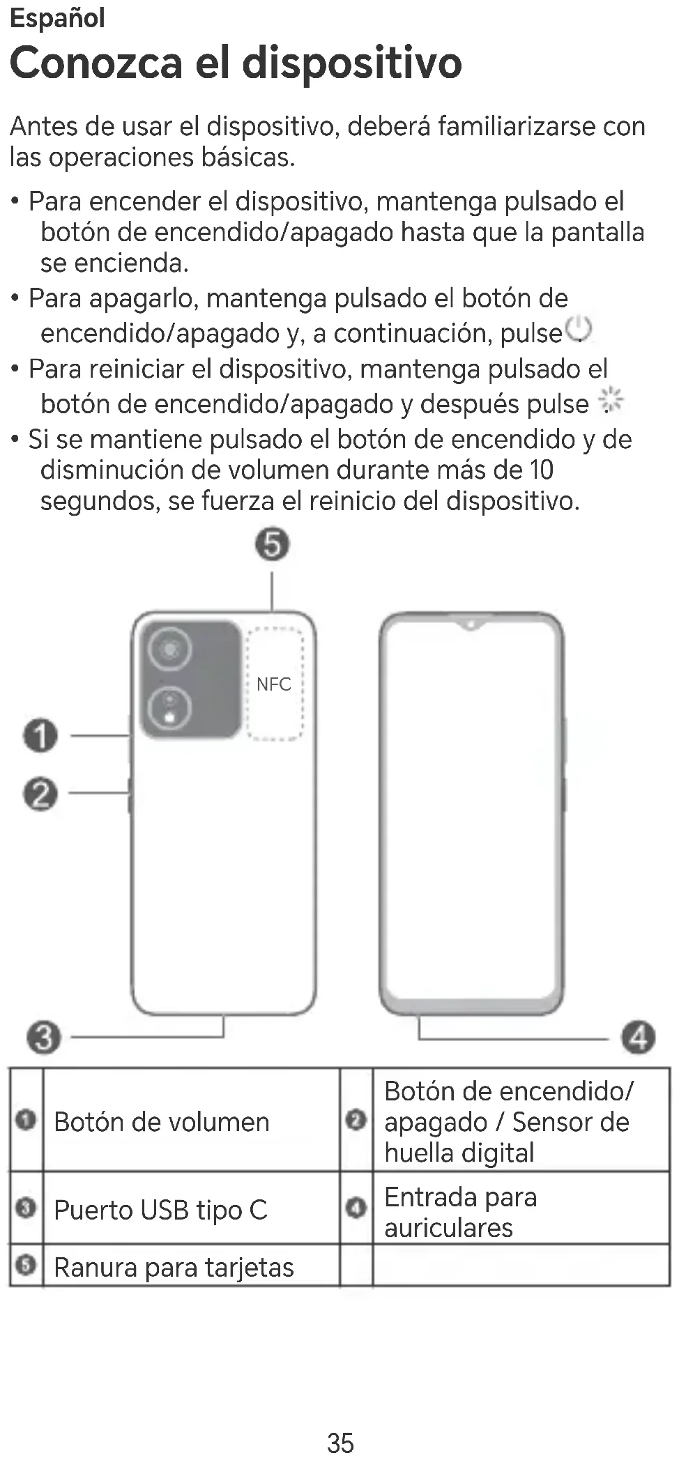 Botón de volumen Botón de encendido/ apagado / Sensor de huella digital Pueo USB tipo C Entrada para auriculares Ranura para tarjetas 35• Mantenga el área NFC cerca de los otros dispositivos u objetos cuando utilice la función NFC.