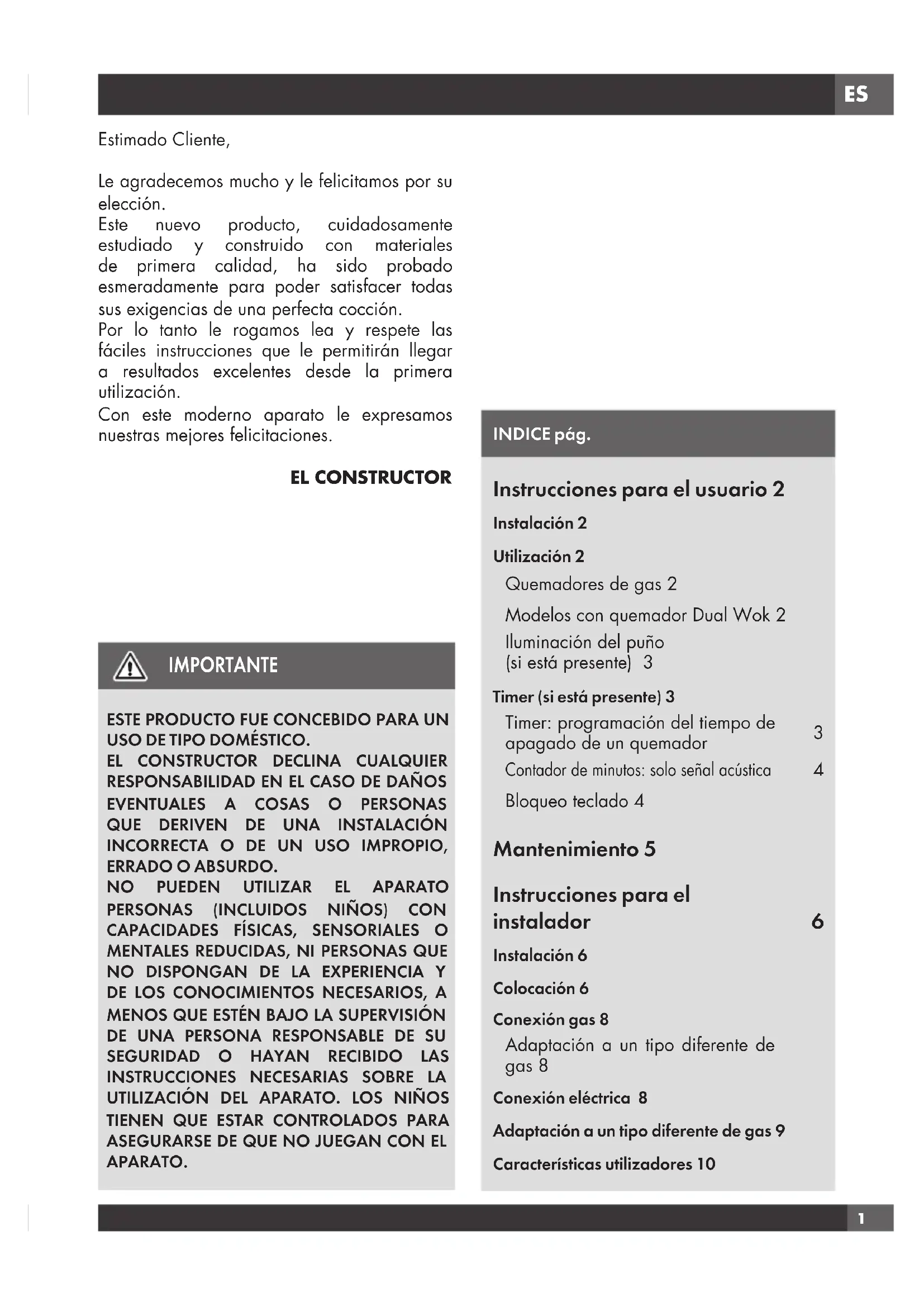ASEGURARSE DE QUE NO JUEGAN CON EL APARATO. INDICE pág. Instrucciones para el usuario 2 Instalación 2 Utilización 2 Quemadores de gas 2 Modelos con quemador Dual Wok 2 Iluminación del puño (si está presente) 3 Timer (si está presente) 3 Timer: programación del tiempo de apagado de un quemador