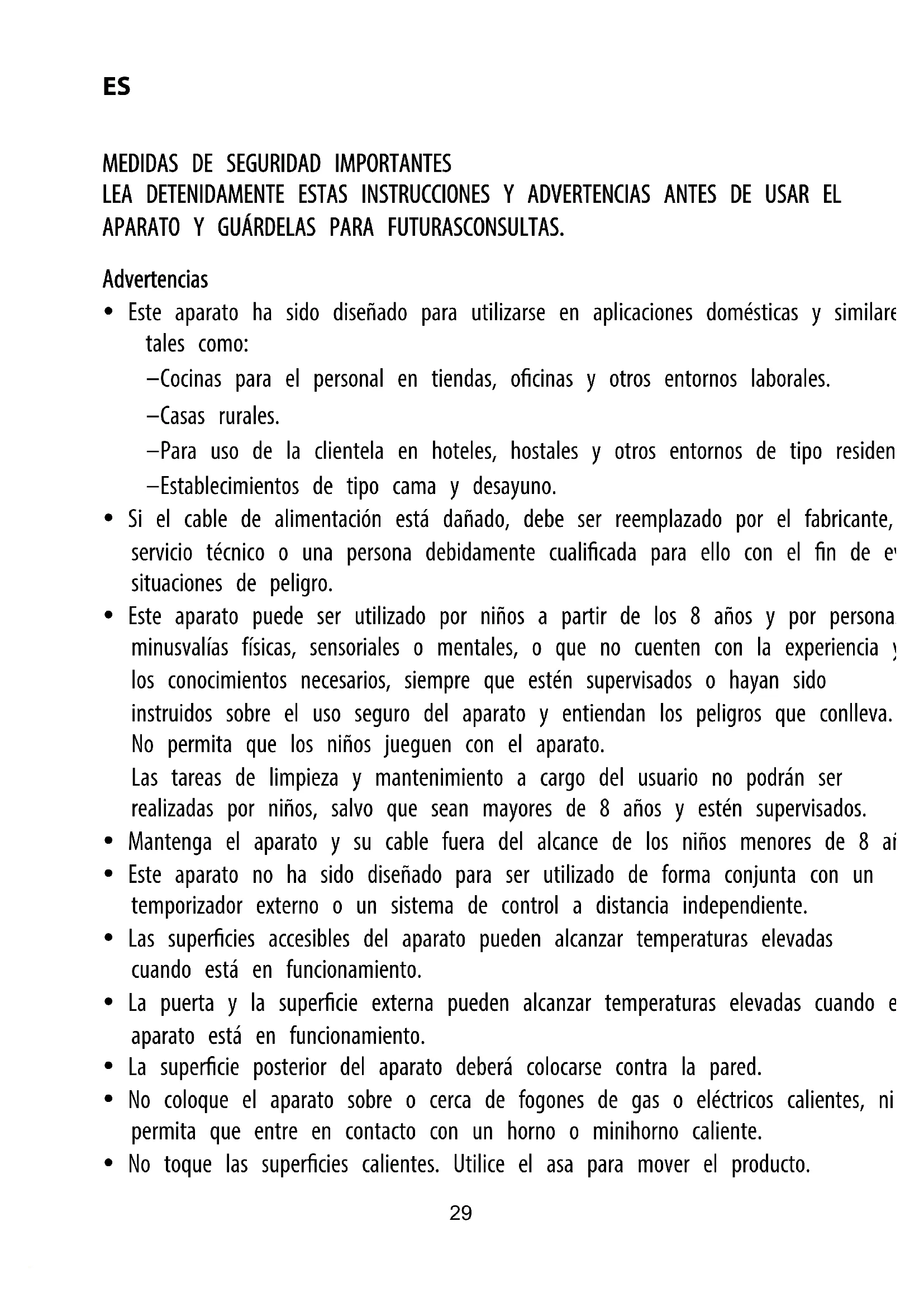 LEA DETENIDAMENTE ESTAS INSTRUCCIONES Y ADVERTENCIAS ANTES DE USAR EL APARATO Y GUÁRDELAS PARA FUTURASCONSULTAS. Advertencias Este aparato ha sido diseñado para utilizarse en aplicaciones domésticas y similares, tales como: ‒Cocinas para el personal en tiendas, oficinas y otros entornos laborales. ‒Casas rurales. ‒Para uso de la clientela en hoteles, hostales y otros entornos de tipo residencial. ‒Establecimientos de tipo cama y desayuno. Si el cable de alimentación está dañado, debe ser reemplazado por el fabricante, su servicio técnico o una persona debidamente cualificada para ello con el fin de evitar situaciones de peligro. Este aparato puede ser utilizado por niños a partir de los 8 años y por personas con minusvalías físicas, sensoriales o mentales, o que no cuenten con la experiencia y los conocimientos necesarios, siempre que estén supervisados o hayan sido instruidos sobre el uso seguro del aparato y entiendan los peligros que conlleva. No permita que los niños jueguen con el aparato. Las tareas de limpieza y mantenimiento a cargo del usuario no podrán ser realizadas por niños, salvo que sean mayores de 8 años y estén supervisados. Mantenga el aparato y su cable fuera del alcance de los niños menores de 8 años. Este aparato no ha sido diseñado para ser utilizado de forma conjunta con un temporizador externo o un sistema de control a distancia independiente. Las superficies accesibles del aparato pueden alcanzar temperaturas elevadas cuando está en funcionamiento. La puerta y la superficie externa pueden alcanzar temperaturas elevadas cuando el aparato está en funcionamiento. La superficie posterior del aparato deberá colocarse contra la pared. No coloque el aparato sobre o cerca de fogones de gas o eléctricos calientes, ni permita que entre en contacto con un horno o minihorno caliente. No toque las superficies calientes. Utilice el asa para mover el producto.30