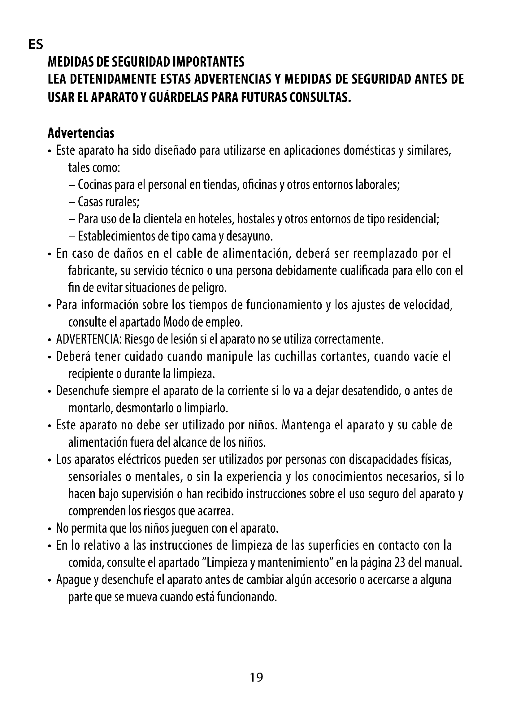 - Mantenga las manos, el cabello, la ropa, así como las espátulas y otros utensilios de cocina, alejados de las varillas batidoras durante su utilización para reducir el riesgo de lesiones a personas y/o daños en la batidora.