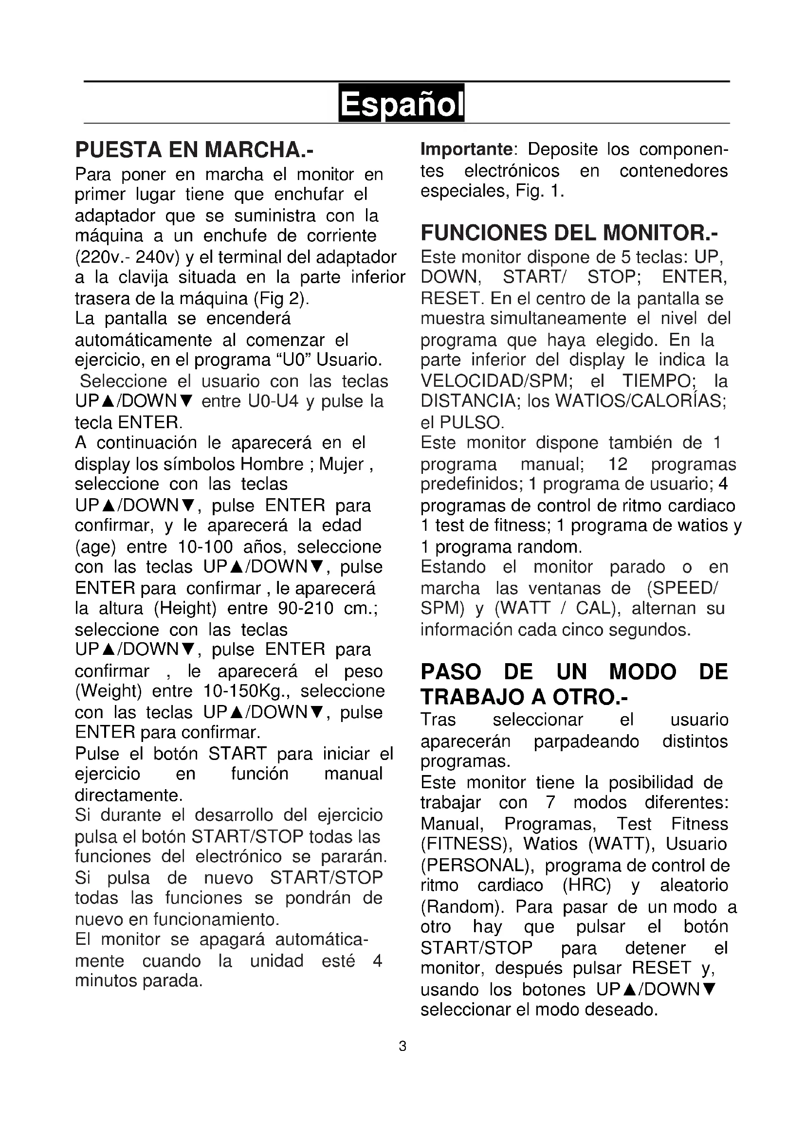 Para poner en marcha el monitor en primer lugar tiene que enchufar el adaptador que se suministra con la máquina a un enchufe de corriente (220v.- 240v) y el terminal del adaptador a la clavija situada en la parte inferior trasera de la máquina (Fig 2). La pantalla se encenderá automáticamente al comenzar el ejercicio, en el programa “U0” Usuario. Seleccione el usuario con las teclas UP▲/DOWN▼ entre U0-U4 y pulse la tecla ENTER. A continuación le aparecerá en el display los símbolos Hombre ; Mujer , seleccione con las teclas UP▲/DOWN▼, pulse ENTER para confirmar, y le aparecerá la edad (age) entre 10-100 años, seleccione con las teclas UP▲/DOWN▼, pulse ENTER para confirmar , le aparecerá la altura (Height) entre 90-210 cm.; seleccione con las teclas UP▲/DOWN▼, pulse ENTER para confirmar , le aparecerá el peso (Weight) entre 10-150Kg., seleccione con las teclas UP▲/DOWN▼, pulse ENTER para confirmar. Pulse el botón START para iniciar el ejercicio en función manual directamente. Si durante el desarrollo del ejercicio pulsa el botón START/STOP todas las funciones del electrónico se pararán. Si pulsa de nuevo START/STOP todas las funciones se pondrán de nuevo en funcionamiento. El monitor se apagará automática- mente cuando la unidad esté 4 minutos parada. Importante: Deposite los componen- tes electrónicos en contenedores especiales, Fig. 1.