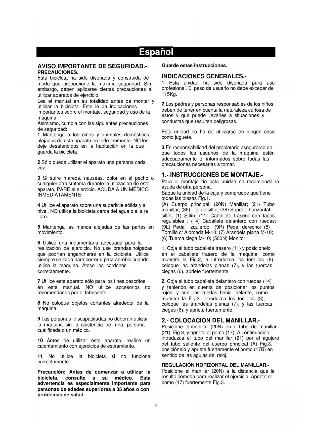 PRECAUCIONES. Esta bicicleta ha sido diseñada y construida de modo que proporcione la máxima seguridad. Sin embargo, deben aplicarse ciertas precauciones al utilizar aparatos de ejercicio. Lea el manual en su totalidad antes de montar y utilizar la bicicleta. Este le da indicaciones importantes sobre el montaje, seguridad y uso de la máquina. Asimismo, cumpla con las siguientes precauciones de seguridad: 1 Mantenga a los niños y animales domésticos, alejados de este aparato en todo momento. NO los deje desatendidos en la habitación en la que guarda la bicicleta. 2 Sólo puede utilizar el aparato una persona cada vez. 3 Si sufre mareos, nauseas, dolor en el pecho o cualquier otro síntoma durante la utilización de este aparato, PARE el ejercicio. ACUDA A UN MÉDICO INMEDIATAMENTE. 4 Utilice el aparato sobre una superficie sólida y a nivel. NO utilice la bicicleta cerca del agua o al aire libre. 5 Mantenga las manos alejadas de las partes en movimiento. 6 Utilice una indumentaria adecuada para la realización de ejercicio. No use prendas holgadas que podrían engancharse en la bicicleta. Utilice siempre calzado para correr o para aeróbic cuando utilice la máquina. Átese los cordones correctamente. 7 Utilice este aparato sólo para los fines descritos en este manual. NO utilice accesorios no recomendados por el fabricante. 8 No coloque objetos cortantes alrededor de la máquina. 9 Las personas discapacitadas no deberán utilizar la máquina sin la asistencia de una persona cualificada o un médico. 10 Antes de utilizar este aparato, realice un calentamiento con ejercicios de estiramiento. 11 No utilice la bicicleta si no funciona correctamente. Precaución: Antes de comenzar a utilizar la bicicleta, consulte a su médico. Esta advertencia es especialmente importante para personas de edades superiores a 35 años o con problemas de salud. Guarde estas instrucciones. INDICACIONES GENERALES.- 1 Esta unidad ha sido diseñada para uso profesional. El peso de usuario no debe exceder de 115Kg. 2 Los padres y personas responsables de los niños deben de tener en cuenta la naturaleza curiosa de estos y que puede llevarles a situaciones y conductas que resulten peligrosas. Esta unidad no ha de utilizarse en ningún caso como juguete. 3 Es responsabilidad del propietario asegurarse de que todos los usuarios de la máquina estén adecuadamente e informados sobre todas las precauciones necesarias a tomar.