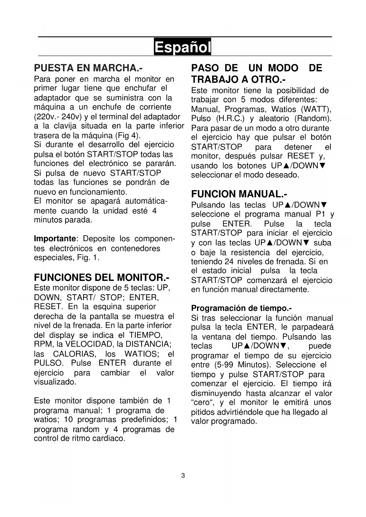 Para poner en marcha el monitor en primer lugar tiene que enchufar el adaptador que se suministra con la máquina a un enchufe de corriente (220v.- 240v) y el terminal del adaptador a la clavija situada en la parte inferior trasera de la máquina (Fig 4). Si durante el desarrollo del ejercicio pulsa el botón START/STOP todas las funciones del electrónico se pararán. Si pulsa de nuevo START/STOP todas las funciones se pondrán de nuevo en funcionamiento. El monitor se apagará automática- mente cuando la unidad esté 4 minutos parada. Importante: Deposite los componen- tes electrónicos en contenedores especiales, Fig. 1.