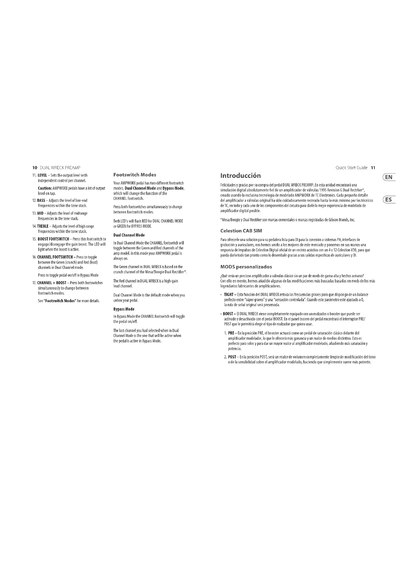 simultaneously to change between footswitch modes. See “Footswitch Modes” for more details. Introducción Felicidades y gracias por su compra del pedal DUAL WRECK PREAMP. En esta unidad encontrará una simulación digital absolutamente el de un amplicador de válvulas 1995 Revision G Dual Rectier*, creado usando la exclusiva tecnología de modelado AMPWORX de TC Electronics. Cada pequeño detalle del amplicador a válvulas original ha sido cuidadosamente recreado hasta lo más mínimo por los técnicos de TC, en todo y cada uno de los componentes del circuito para darle la mejor experiencia de modelado de amplicador digital posible. *Mesa/Boogie y Dual Rectier son marcas comerciales o marcas registradas de Gibson Brands, Inc. Celestion CAB SIM Para ofrecerle una solución para su pedalera lista para DI para la conexión a sistemas PA, interfaces de grabación y auriculares, nos hemos unido a los mejores de este mercado y ponemos en sus manos una respuesta de impulsos de Celestion Digital ocial de un recinto acústico con un 4 x 12 Celestion V30, para que pueda darlo todo tan pronto como lo desembale gracias a sus salidas especícas de auriculares y DI. MODS personalizados ¿Qué sería un precioso amplicador a válvulas clásico sin un par de mods de gama alta y hechos a mano? Con ello en mente, hemos añadido algunas de las modicaciones más buscadas basadas en mods de los más legendarios fabricantes de amplicadores.