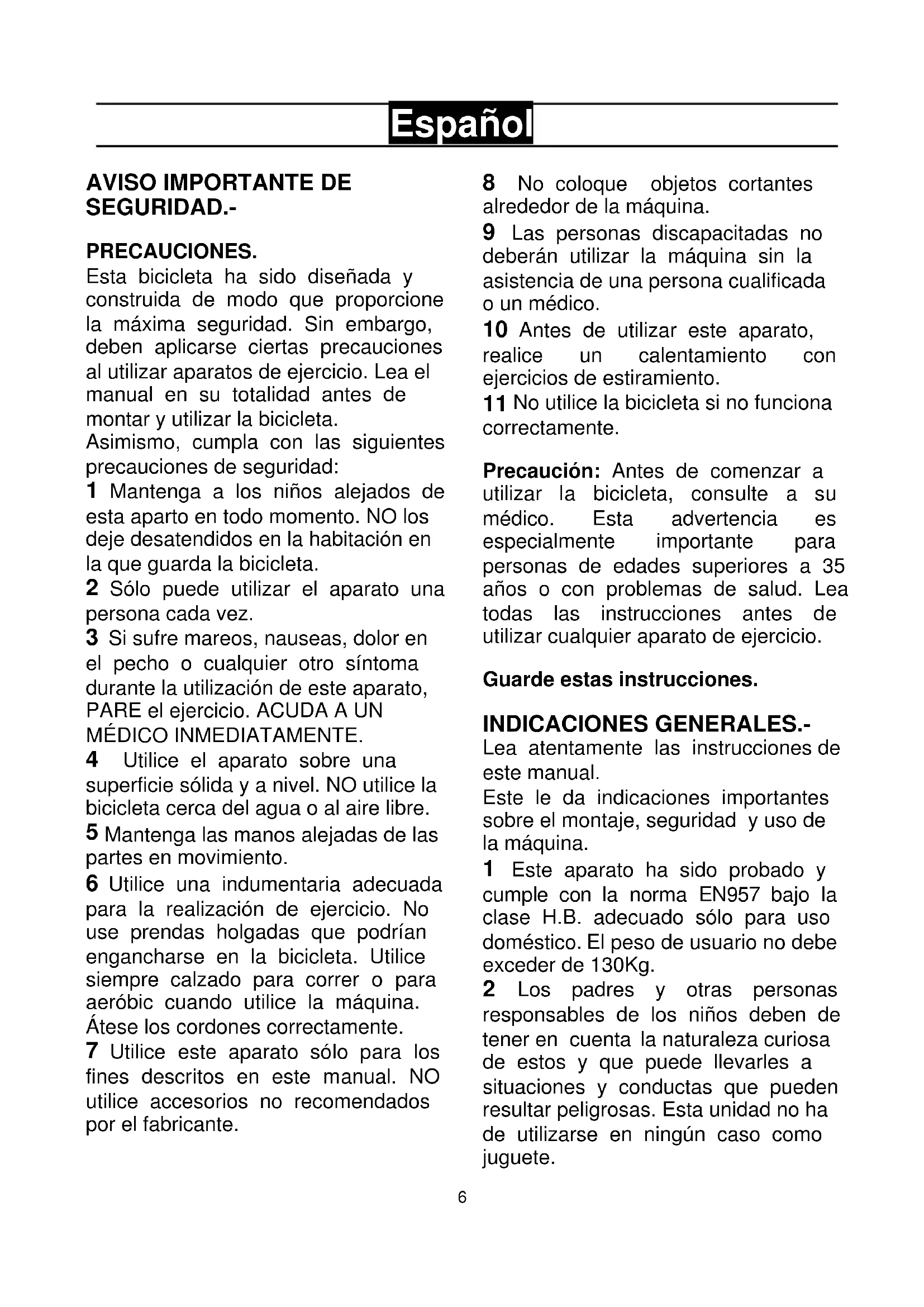No utilice la bicicleta si no funciona correctamente. Precaución: Antes de comenzar a utilizar la bicicleta, consulte a su médico. Esta advertencia es especialmente importante para personas de edades superiores a 35 años o con problemas de salud. Lea todas las instrucciones antes de utilizar cualquier aparato de ejercicio. Guarde estas instrucciones. INDICACIONES GENERALES.- Lea atentamente las instrucciones de este manual. Este le da indicaciones importantes sobre el montaje, seguridad y uso de la máquina.