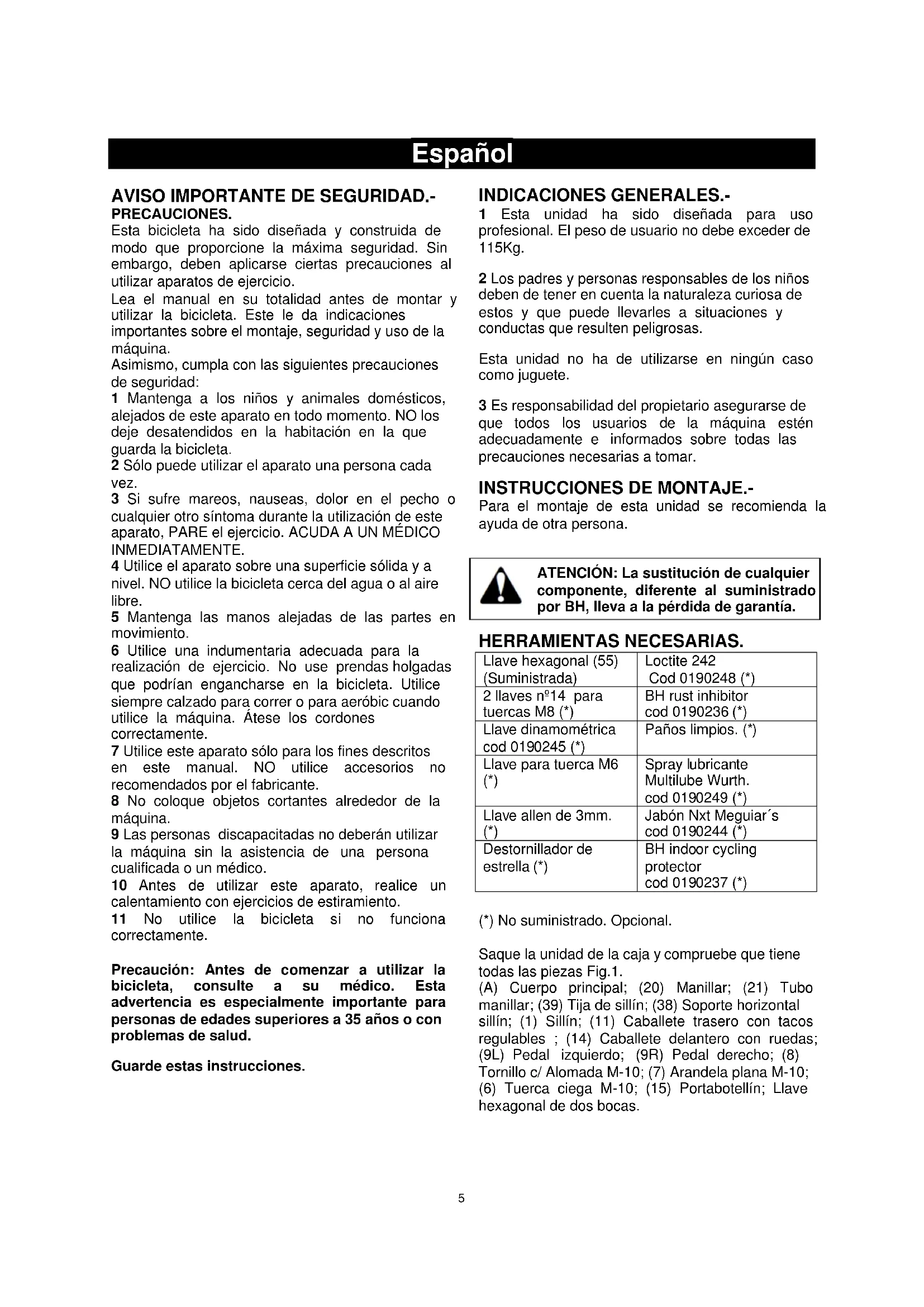 PRECAUCIONES. Esta bicicleta ha sido diseñada y construida de modo que proporcione la máxima seguridad. Sin embargo, deben aplicarse ciertas precauciones al utilizar aparatos de ejercicio. Lea el manual en su totalidad antes de montar y utilizar la bicicleta. Este le da indicaciones importantes sobre el montaje, seguridad y uso de la máquina. Asimismo, cumpla con las siguientes precauciones de seguridad: 1 Mantenga a los niños y animales domésticos, alejados de este aparato en todo momento. NO los deje desatendidos en la habitación en la que guarda la bicicleta. 2 Sólo puede utilizar el aparato una persona cada vez. 3 Si sufre mareos, nauseas, dolor en el pecho o cualquier otro síntoma durante la utilización de este aparato, PARE el ejercicio. ACUDA A UN MÉDICO INMEDIATAMENTE. 4 Utilice el aparato sobre una superficie sólida y a nivel. NO utilice la bicicleta cerca del agua o al aire libre. 5 Mantenga las manos alejadas de las partes en movimiento. 6 Utilice una indumentaria adecuada para la realización de ejercicio. No use prendas holgadas que podrían engancharse en la bicicleta. Utilice siempre calzado para correr o para aeróbic cuando utilice la máquina. Átese los cordones correctamente. 7 Utilice este aparato sólo para los fines descritos en este manual. NO utilice accesorios no recomendados por el fabricante. 8 No coloque objetos cortantes alrededor de la máquina. 9 Las personas discapacitadas no deberán utilizar la máquina sin la asistencia de una persona cualificada o un médico. 10 Antes de utilizar este aparato, realice un calentamiento con ejercicios de estiramiento. 11 No utilice la bicicleta si no funciona correctamente. Precaución: Antes de comenzar a utilizar la bicicleta, consulte a su médico. Esta advertencia es especialmente importante para personas de edades superiores a 35 años o con problemas de salud. Guarde estas instrucciones.